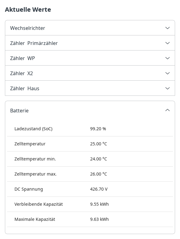 Wie gut deine 128 Batteriezellen der HVS 10.2 sind, siehst du nur in den Sekunden vor Ladeschluss bei 100% SoC und Entladeschluss bei 5%. Alle anderen Werte dazwischen sind für eine Analyse weniger bis nicht geeignet.