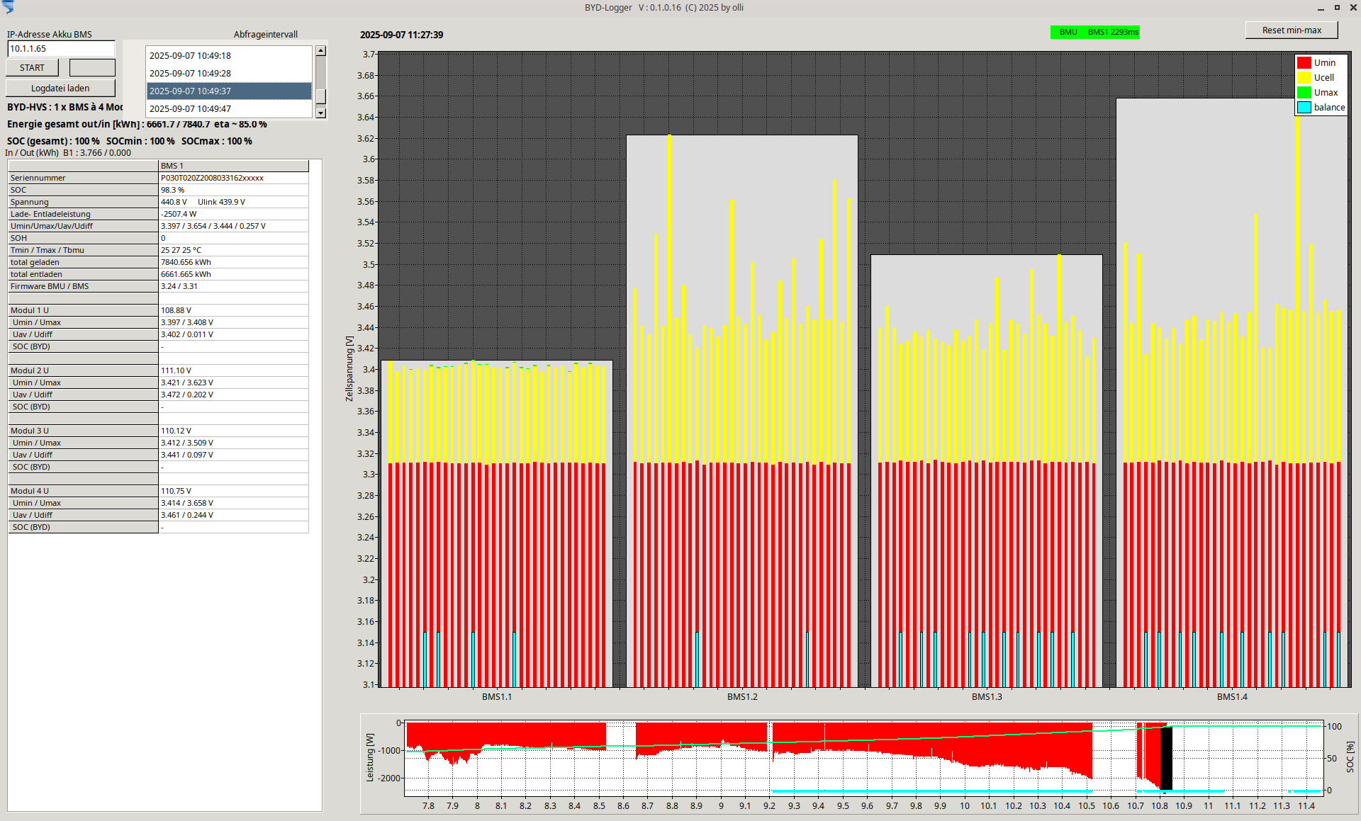 Ich habe einen kleinen Mini Windows PC 24 Stunden laufen (gibt es gebraucht für unter 100 Euro), auf dem alle möglichen Dienste installiert sind. Unter anderem läuft dort für jede Batterie eine Instanz von Olli's Tool und - ja - es wird alles mitprotokolliert. Das schaue ich mir aber normalerweise nicht an, nur wenn mal aufällige Erstindikationen sind und ich auf die Suche nach den Ursachen gehen muss.