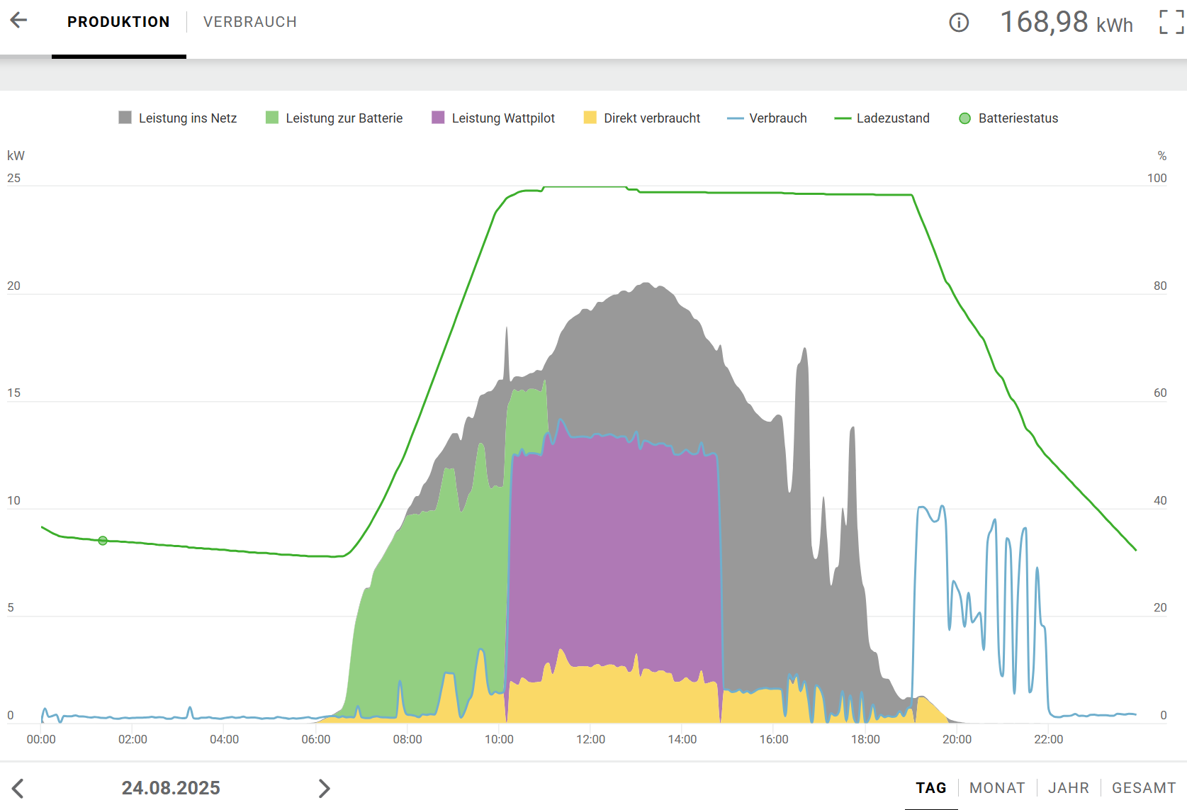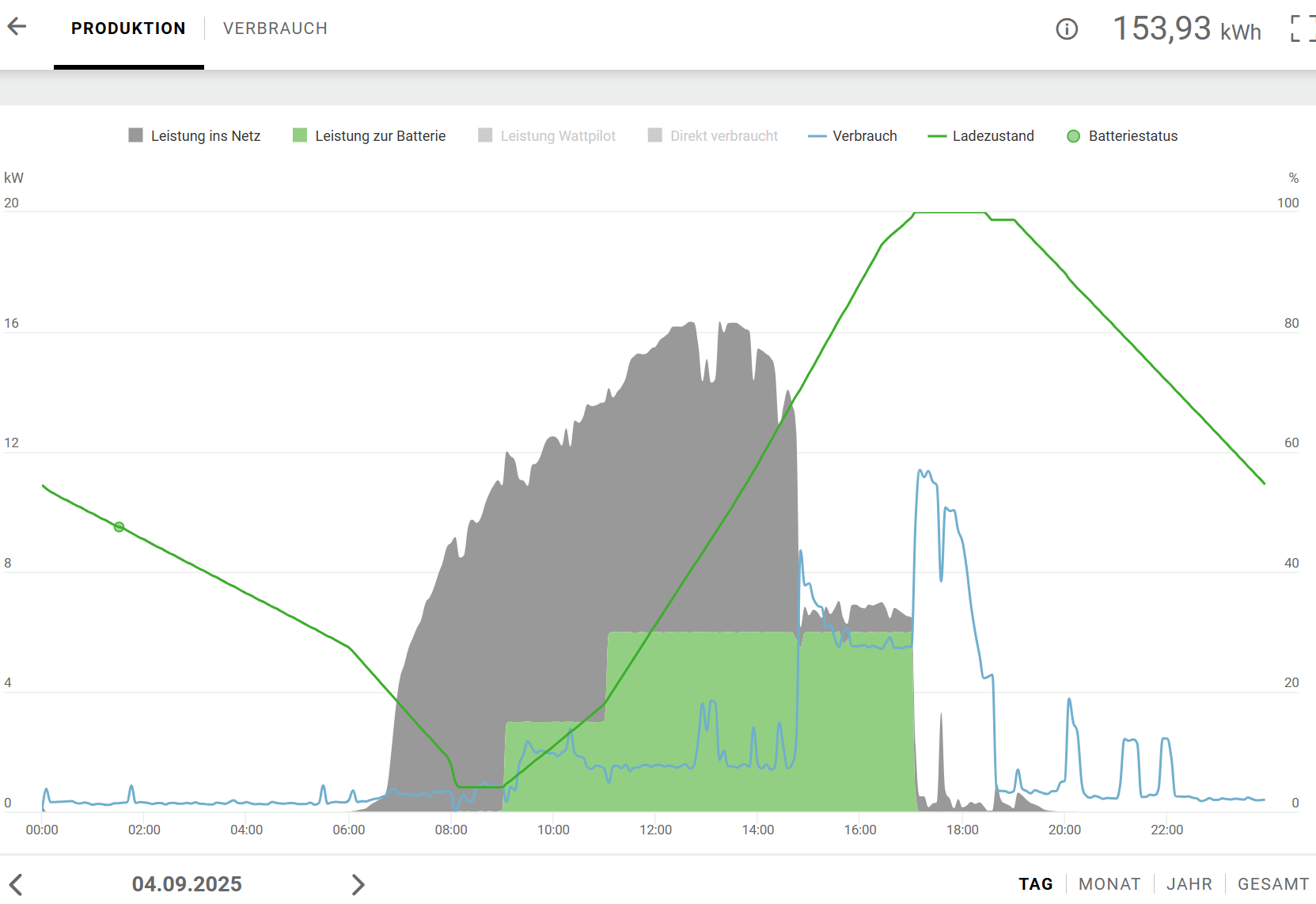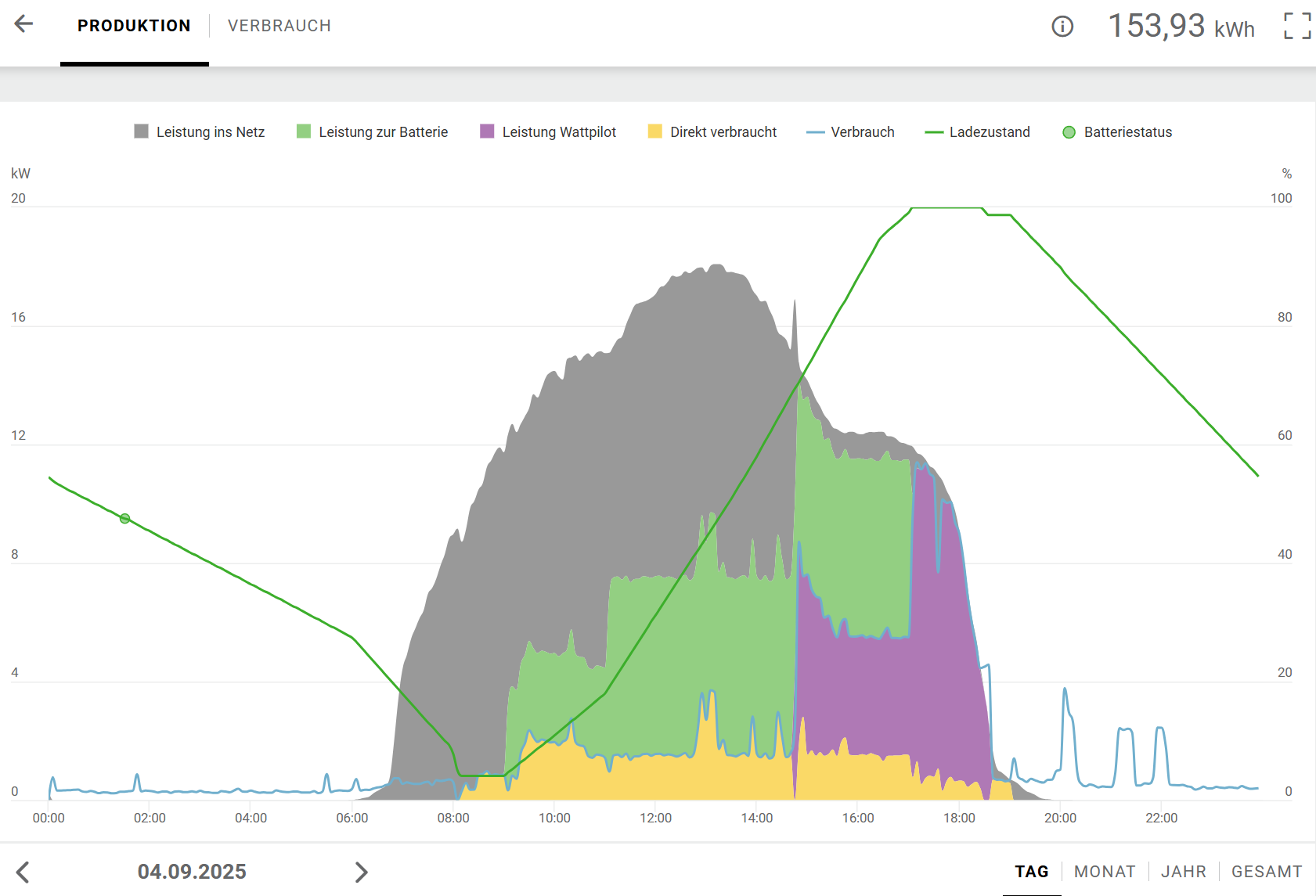 zuweilen muss die Batterie auch den Saunabetrieb mit abdecken (von 19-22 Uhr, geht zu 100%) und wenn das eAuto tagsüber darnn ist, wird halt die Batterie am Vormittag geladen