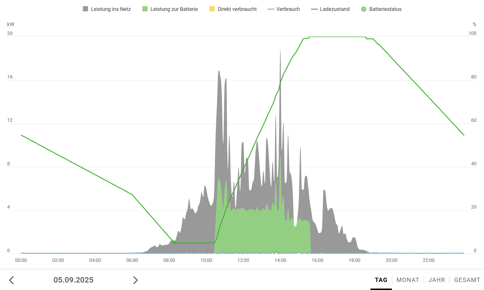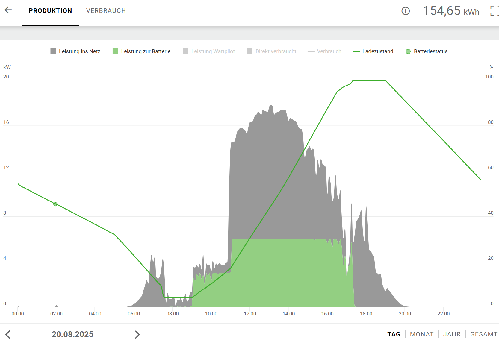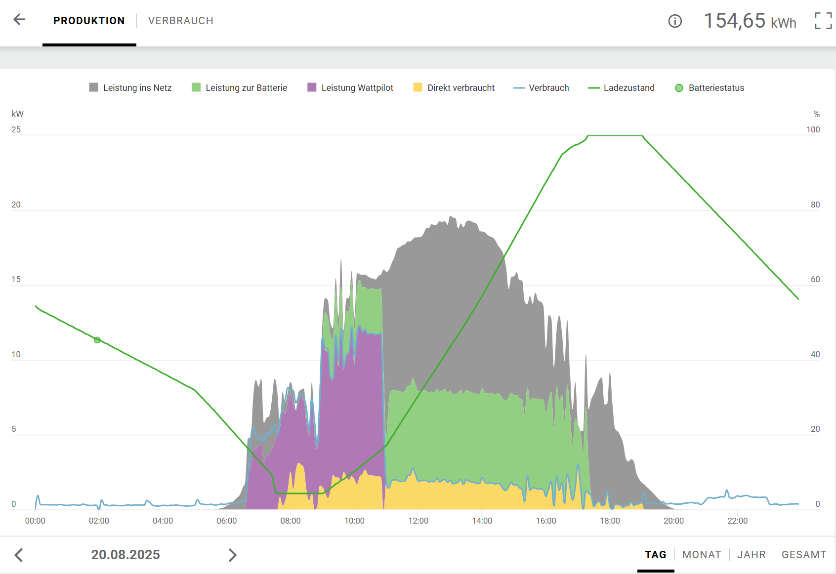 zuweilen muss die Batterie auch den Saunabetrieb mit abdecken (von 19-22 Uhr, geht zu 100%) und wenn das eAuto tagsüber darnn ist, wird halt die Batterie am Vormittag geladen