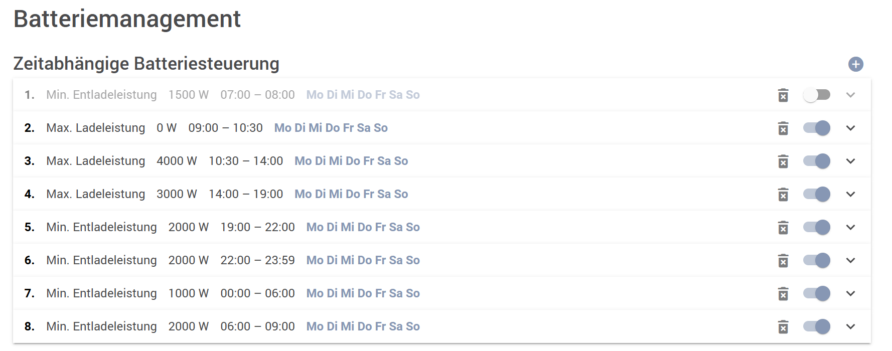 Aber es geht bei den Verbrauchern aufgestellte Batterien geht es auch. Anbei ein typischer Zyklus bei den Batterien bei mir zu Hause (Ladeleistung auf 3 bzw 6 kW begrenzt)