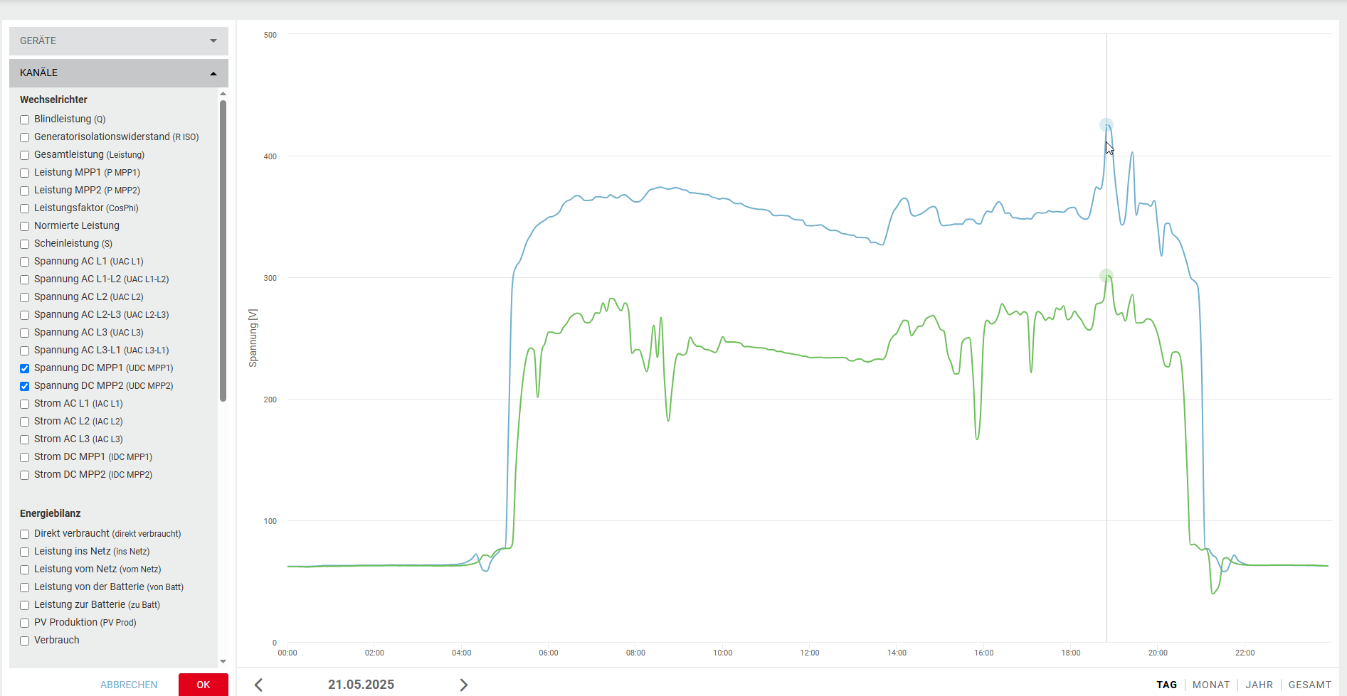 und exakt zum Zeitpunkt des Ausfalles hat der deutlich stärker belegte MPP Ausschläge jenseits der 400 V im Log - echt Spitzen sieht man leider wegen dem Loggin im 5-Minuten Tagkt nicht
