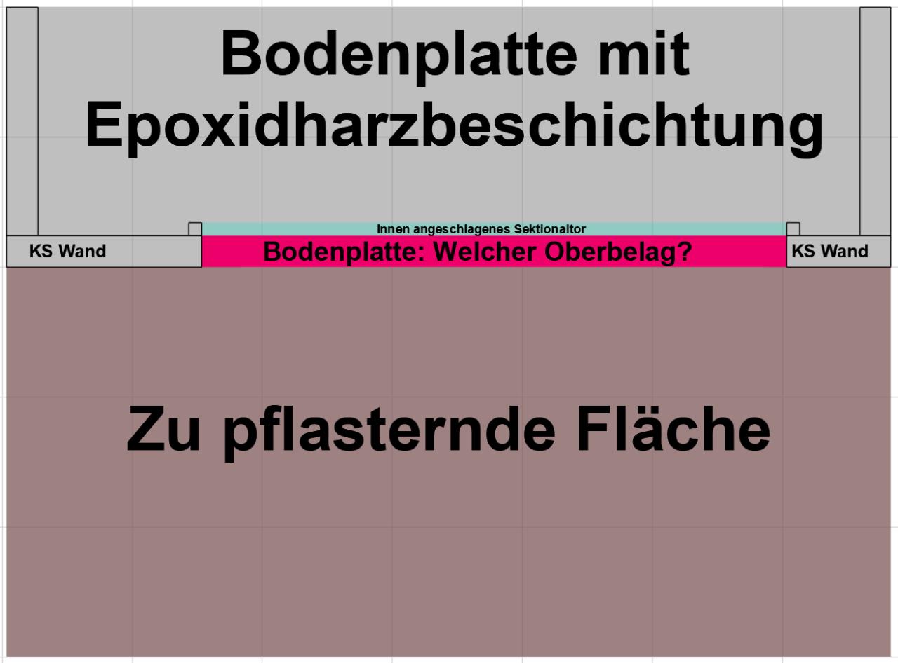 Meiner Meinung ein Planungsfehler im Detail. Kann man auch nicht vernünftig ab/andichten. Bei uns liegt ein Estrich in der Garage. Dieser schließt ihnen an einen Winkel an, welcher gleichzeitig der Auflagepunkt für das Tor ist. Außen wurde der Winkel sowie die Laibung mit Flüssigkunststoff abgedichtet. Die Pflasterung kann somit an den Winkel anschließen. Im Laibungsbereich vermutlich mit Kleber anstatt Split. Bei deinem Detail hätte die Bodenplatte ohne Estrich einen Sprung nach unten machen müssen, damit man das sauber lösen kann. |