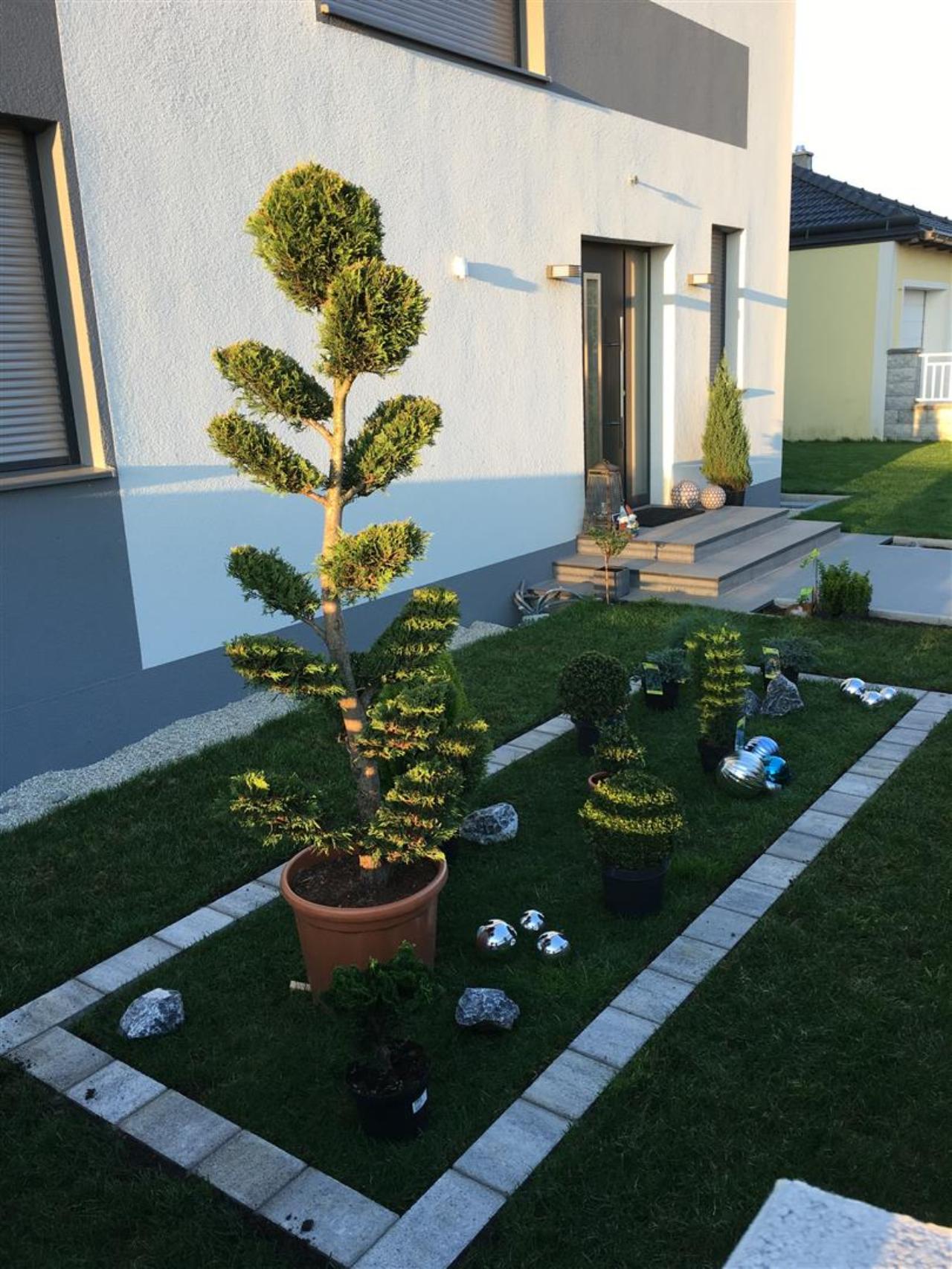 Hier mal die Arbeit vom WE. Was haltet ihr von der Anordnung der Bäume? So in etwa würde ich die dann Setzen und dann wird das Gras entfernt, Vlies verlegt und dann entweder mit Rindenmulch oder Ziersteine verdeckt. Die Umrandung wurde von mir in Trockenbeton verlegt und verfugt. Sind eigentlich Pflastersteine (Semmelrock Rettango), die von der Einfahrt übrig geblieben sind. Ich bitte um Anregungen bzw. um euer Feedback!