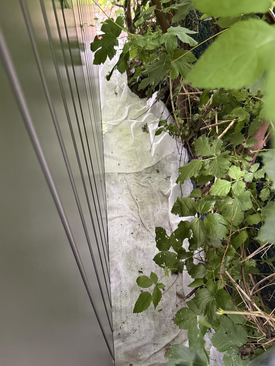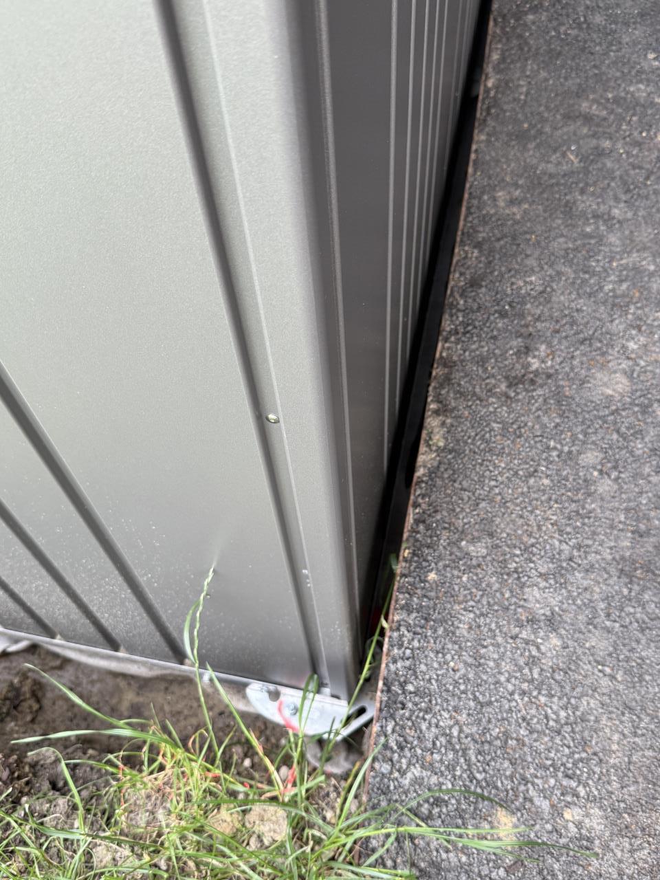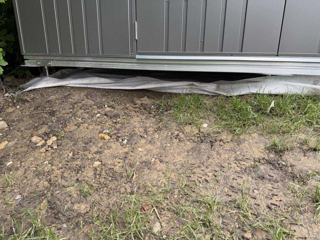 Das Gelände wurde zwar durch eine Gartenbaufirma planiert, war aber trotzdem nicht eben genug. Beim Aufbau durch den Biohort-Montagepartner musste daher doch über die Erdschrauben stark nivelliert werden – viel mehr als erwartet. Dadurch entstand an der Talseite (Türseite) ein Spalt von ca. 10–12 cm zwischen Erdreich und Hüttenunterkante.