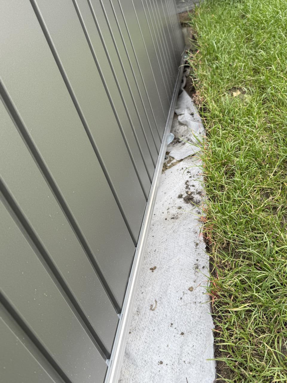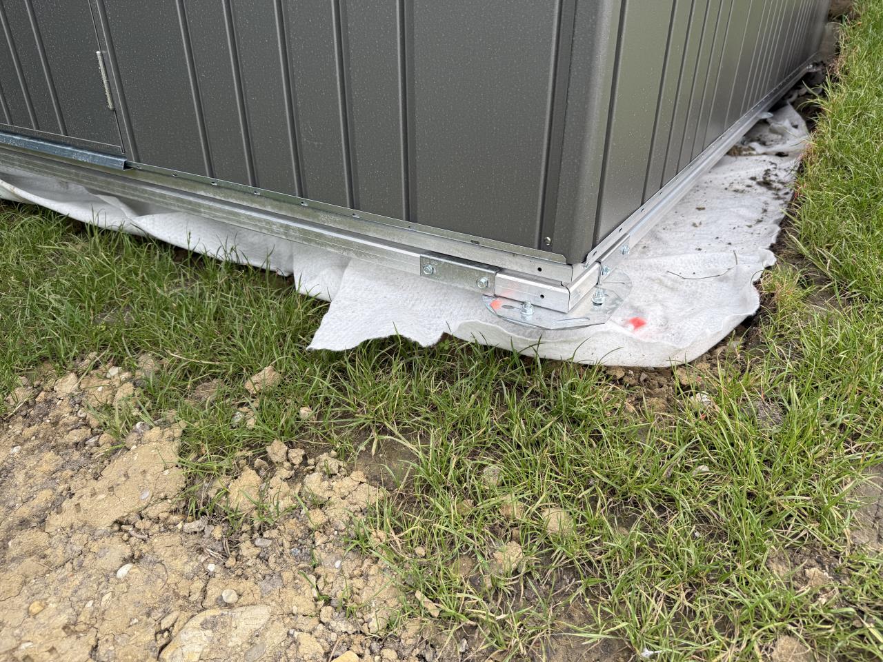 • An allen vier Ecken stehen Metallteile leicht über (vermutlich zur Verankerung gedacht). Ich habe zwei kleine Kinder (2 und 4 Jahre) und sehe hier Verletzungsgefahr. Die beiden Ecken zur Hecke hin sind nich wirklich relevant. Eine Ecke zum Gehweg wird nach Verfüllung unter Erdniveau liegen. Aber eine Ecken zum Rasen hin sehe ich als problematisch, da sie derzeit (durch die Nivellierung über die Schrauben) noch dazu in der Luft hängt.
