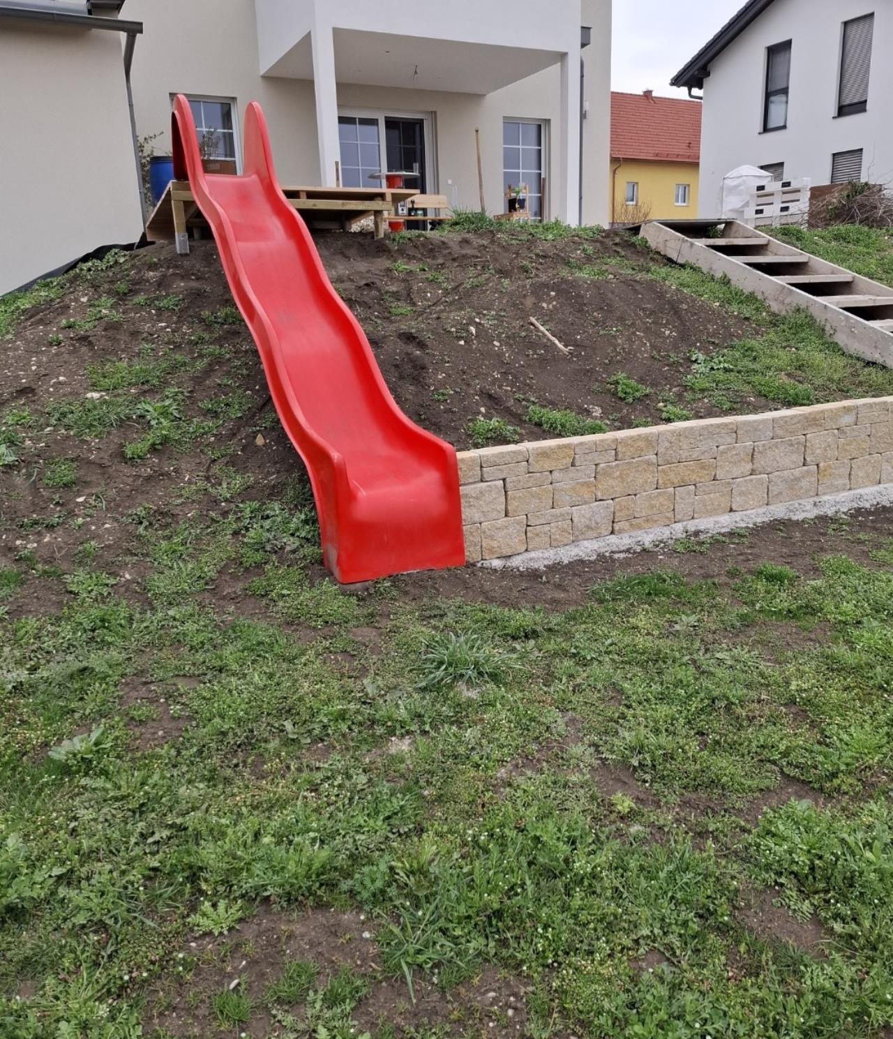 Das Deck oben für die Rutsche finde ich cool. Da würde sich platzmässig daneben auch noch ein kleines Spielhäuschen ausgehen. Der Hügel schaut momentan natürlich noch ziemlich frustrierend aus, aber wenn ihr im Frühjahr etwas pflanzt, dann ist es im Sommer schon manierlich. Aus meiner Sicht sollte man durch den Hügel auf jeden Fall in der Höhe staffeln. Hinten eher höhere Pflanzen (zB Gräser, Ranunkel, Blauraute, Duftnessel, Hibiskus,... ) und davor mittelhohe (zB Echinazea, Lavendel, Malven, Ringelblume, Astern, Hortensie,...) und gegen Unkraut dazwischen Bodendecker (zB Storchenschnabel,...). Und keine Hemmungen bei Bäumen auch an schrägen Standorten: wenn man Obstbäume wie Pfirsich, Apfel, Zwetschke durch Rückschnitt eher klein hält oder als Spallierobst hoch zieht, dann kann man das auch bei einem Hügel gut machen. Ich würde dabei nur schauen dass der Baum eher nördlich im Beet steht, damit er nicht allen anderen Pflanzen Schatten macht. |
