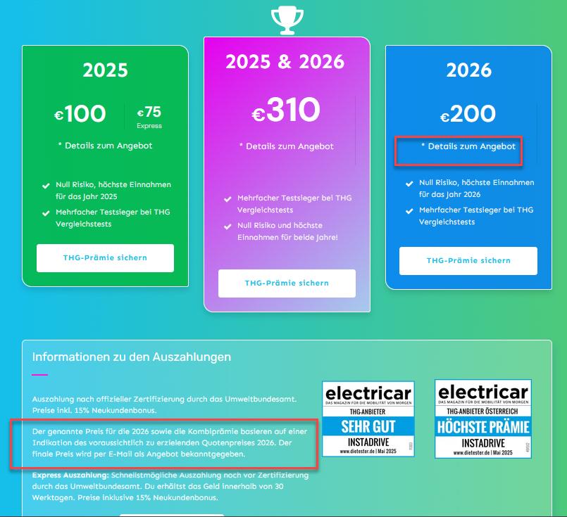 Ich hatte in 6/2025 die THG-Quote bei Instadrive beantragt (wohne in DE). Da es bei Insta automatisch weiterläuft, habe ich in 12/2025 per Email gekündigt. Empfangsbestätigung habe ich erhalten, sonst noch nichts. Jetzt habe ich gesehen, dass die am 27.11. eine Email geschickt hatten mit 170€ THG für 2026 und dass ich mit ihrem Abo nichts verpasse und so. Darin steht auch (im Kleingedruckten), dass ich jederzeit kündigen kann ... allerdings wenn sie innerhalb 14 Tage nichts von mir hören, dann werten sie es als Zustimmung und kümmern sich auch in 2026 um meine THG-Quote. Was ist davon zu halten? Ich gehe davon aus, dass ich noch in 2025 wirksam gekündigt habe. "Nur" 170€ für 2026 würde mich nicht umbringen, Aber es gibt woanders doch einiges mehr und von so Abosachen bin ich kein Freund |