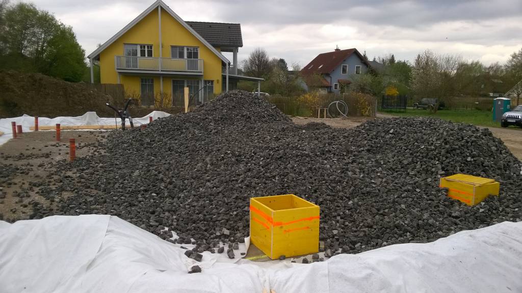 Hmm und ich arbeite im 0,01mm Bereich..... Aber ich hatte ja heute wieder meinen Spaß mit diesem Gewerk. Plan heute: GSS besorgen, auftragen und verdichten. GSS besorgen: man sollte glauben das geht einfach. Ich habe bei Firma A angerufen und gefragt. Ich: "Haben Sie GSS lagernd, wie viel m³ zu welchem Preis?" A: Wir haben 4,5m³ Preis 96.50m³ exkl. Ich: Geht da ned nu a bissl was? A: 15% Ich: Meld mich nochmal in 15 Minuten. Firma Q: Ich: Haben Sie GSS lagernd, wie viel m³ zu welchem Preis? Q: Wir haben 10,5m³ lagernd um € 180 inkl. UST. Ich: Ist der Preis Ihr ernst? Q: ja ich kann aber mal nachfragen was geht. Ich: Ich zahle ned mehr als 95,- Euro.... Q: Er meldet sich. 1h später: Er könne 135,-- machen. Ich: vergess ma des... War ohnehin schon bei Firma A Die ersten 1,5m³ aufn Hänger rauf. Ein schöner BigBag von GeoCell. Am Grund angekommen dann das: Wasn das für ein Müll??? Also erster Anruf nicht bei Händler A, sondern bei GeoCell. War ja immerhin da drin Ich fragte nach, warum das so komisch aussieht und ob ich das einbauen kann. Der Anwendungsspezialist von GeoCell konnte sich nicht vorstellen, von was ich spreche. Also schickte ich Ihm schnell die beiden Bilder. Daraufhin ein Anruf. Geo: Wo hab ich das her? Ich: Händler A Geo: das ist nicht Ihre Ware, das ist Müll. Ich: oha Geo: bringens uns des bitte vorbei. Wir müssen Händler A dazu "befragen". Und holens Ihnen die BigBags von uns. Ich: ja passt (hab ja eh keine andere Möglichkeit) Ich: habens vielleicht die Möglichkeit mir ein Fahrzeug zur Verfügung zu stellen, damit ich nicht so oft fahren muss? Geo: leider nein, wir werden aber eine andere Lösung finden. Naja nachdem ich endlich um 12:15 bei GeoCell war wurde richtiges Material verladen. Ich bekam 2 m² auf meinen Hänger. Das Bild war bereits von der letzten Fuhre. Die 4. Fahrt.... Der Chef persönlich begutachtete die Ware von Händler A. Er war Fassungslos, und zeigte mir ähnliches Material. Und sagte, dass kehren wir zusammen und entsorgen es... Händler A bekommt wohl einen Anwaltsbrief. Als die erste Fuhre endlich am Grund war ca. 13:30 konnte endlich die Arbeit beginnen. Und ich fuhr bereits um die nächsten 2m³. Ab der 2. Fuhr wurde begonnen zu verdichten, was offensichtlich kinderleicht ist: Um ca. 20:00 waren wir mit allem verdichten fertig. Und so haben wir die 1m³ großen Säcke verteilt. man sollte zu 3. sein um Sie angenehm bewegen zu können. Fazit, in der Tat dauert das verdichten etwas lange, wenn man sofort alles aufschüttet. Wir haben es auch um 1-2cm nicht ganz runter bekommen. Teils war es auch durch unser Eigengewicht etwas vorverdichtet.