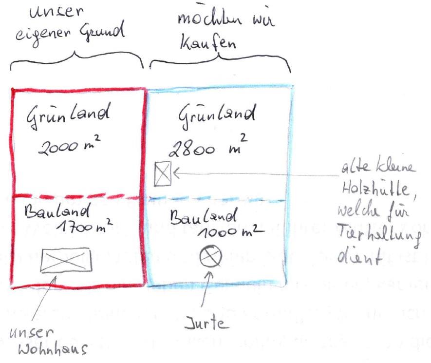 Derzeit haben wir 2.000m² Grünland (meine Frau und ich stehen im Grundbuch). Beim Nachbargrundstück wären es 2.800m² Grünland (das würden wir auch gemeinsam kaufen).