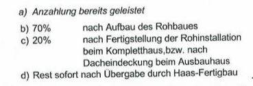 Hier nochmals detailierter: A: Anzahlung (ca. 4% bezahlt) zu diesem Zeitpunkt hat Bauherr erhalten: NIX! B: Rohbau = zweiter Montagetag (70% = ca 74% bezahlt) zu diesem Zeitpunkt erhalten: Einreichplanung, ein einigermaßen dichtes Haus, daher: alle Wände/Decken stehen (ausgenommen OG-Decke) und sind teilweise schon innen beplankt, außen ist großteils schon Wärmedämmung drauf, Fenster, Rolläden, Eingangstüre, mit Planen abgedeckter Dachstuhl, Innenstiege (exkl. Geländer), Dachsteine vorhanden aber noch nicht eingebaut, Sanitär- und Elektroinstallation soweit diese schon im Werk eingebaut wurde (z.B. manche Rollädenmotoren, WC-Spülkästen, Sanitäranschlußblöcke) C: Dachdeckung = ca. 2 Montage-Woche (20% = ca. 94% bezahlt) zu diesem Zeitpunkt erhalten: Dach gedeckt, OG-Decke/Dachboden fertig, Teile der E-Installation und Teile der Sani-Installation und unzählige Details wurden gemacht D: Restzahlung (ca. 6% = 100% bezahlt; offiziell bei Fertigstellung fällig, in der Praxis möchte es Haas aber schon früher). Zu dem Termin an dem Haas bei uns Übergabe machen wollte hat noch gefehlt: Wärmepumpe+Installation, Fußbodenheizung, Fassadenputz, Estrich, div. Kleinigkeiten, und einige Dinge die Haas erst einbaut wenn der bauseitige Innenausbau vorangeschritten ist (KWL-Ventile einbauen und Inbetriebnehmen, Stiegengeländer ...) |