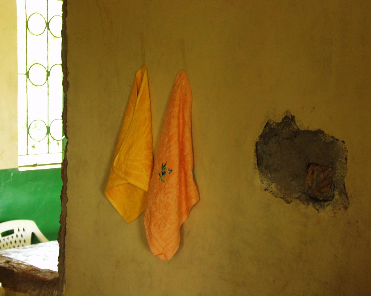 Ein Handtuch hängt am Kastl links neben dem Waschtisch, das andere rechts auf den Fliesen wo der WC Unterbau untergebracht ist.