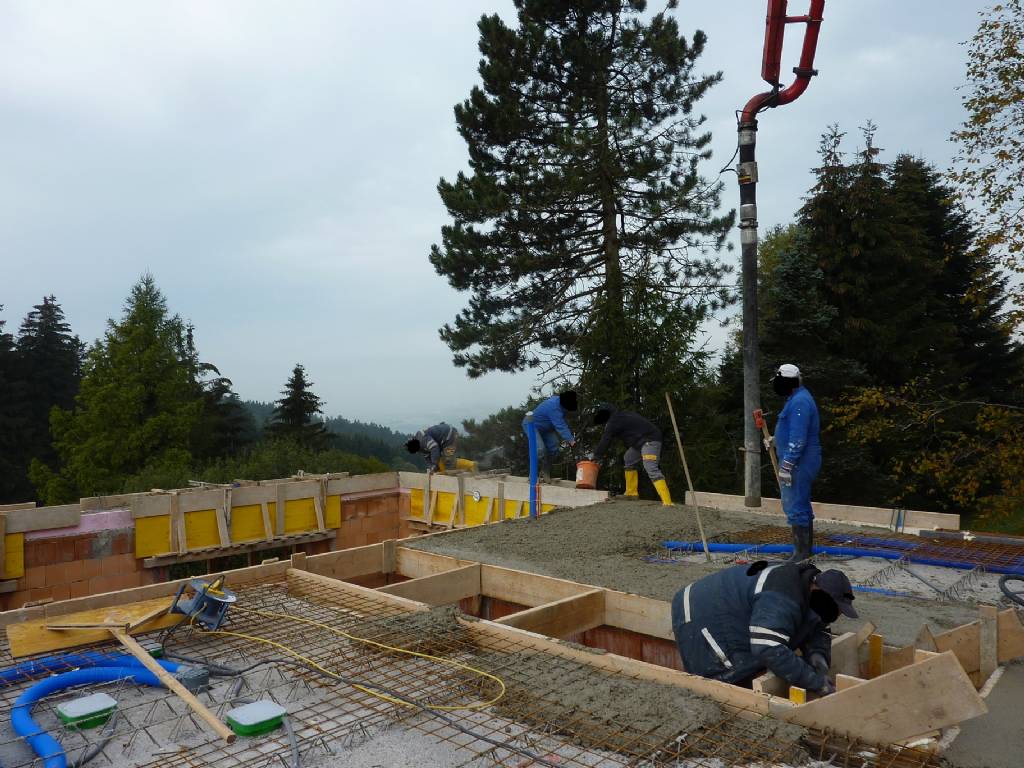 Also die Fertigteile der Betondecke sind (waren bei uns) nur ein paar cm dick. Darauf haben wir dann die ganzen Rohre der KWL KWL [Kontrollierte Wohnraumlüftung] und zusätzlich noch Eisenmatten, etc. verlegt. Das ganze wurde dann einbetoniert.