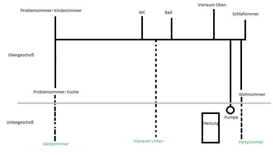 Hab hier mal kurz gezeichnet, soweit ichs sehe und weiß, wie die Leitungen verlaufen/Zimmeraufteilung. Hinweis: Unter dem Kinderzimmer - ist ein Keller unbeheizt. Unter der Küche ist das Gästezimmer. Wie hier die Leitung verläuft weiß ich nicht wirklich. Den die Hauptleitung verläuft unterhalb der Zwischendecke. Und wo von hier aus die Abzweigung bzw die Leitung überhaupt verläuft weiß ich nicht. ABERwird dieses Zimmer passend warm/heiß.