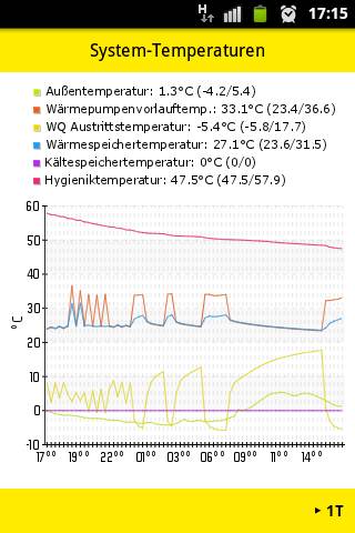 Jetzt beobachte ich die Kurven wieder und hab da Zacken in der Kurve die ich mir nicht ganz erklären kann. Ich mein den Bereich links bis ca. 00 Uhr. Ich habe keine Ahnung was die IDM da macht, das war jetzt an drei Tagen hintereinander. Schaut so aus als ob sich die WP WP [Wärmepumpe] ständig aus und einschaltet, aber ich weiß nicht warum, hier ein paar Eckdaten: Raumtemp Normal: 20,5°C (ergibt ~22,8° im Referenzraum) Raumtemp Eco: 20,3°C (zwischen 22:00 und 6:00) Heizgrenze: 13°C Heizkurve: 0,25 Zuschaltzeit: 15min Raumgerät: nein Min. Vorlauftemp.: 22°C Hysterese: 2° Min. Laufzeit: 10 min Min Stehzeit: 10 min Irgendwelche Ideen? Die min. Stehzeit raufsetzen? |