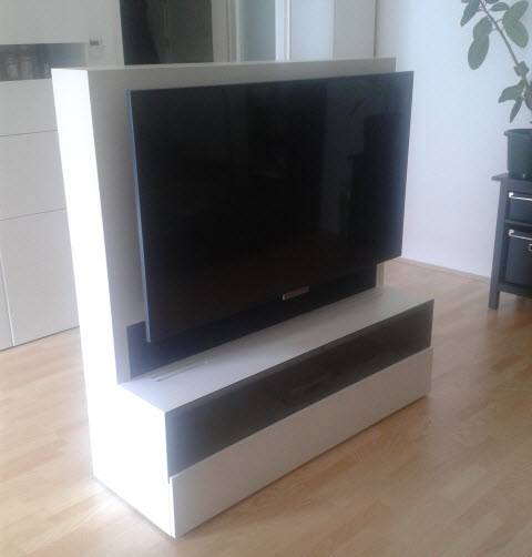 Mein persönliches Highlight in der Wohnung: TV/Audiomöbel als Raumteiler. Anschlüsse über einen Bodenauslass. Hinter schwarzem Akustikstoff die 3 Boxen der Surroundanlage. Verstärker und DVD-Player hinter Rauchglas. Alles selbst konstruiert und vom Tischler gefertigt. Umlaufend lackiert ohne einer Fuge. |
