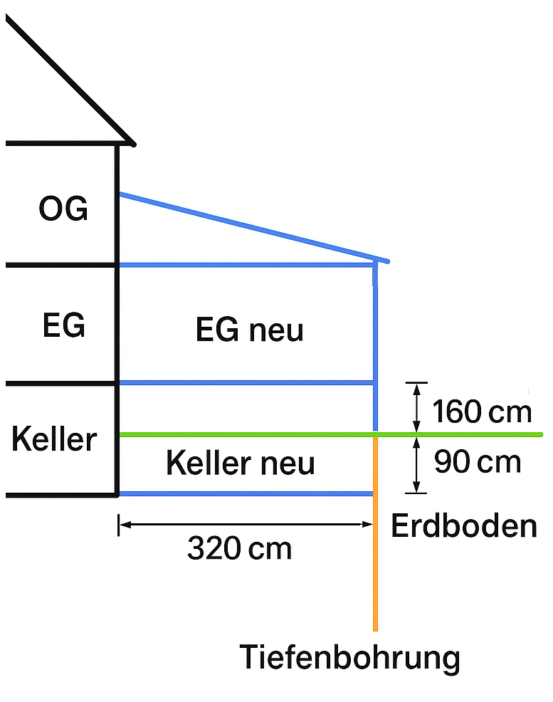 Leider ich.🤦da ich nicht wusste ob der Zubau kommt, wollte ich, dass die Bohrung so nah wie möglich beim alten Haus ist, damit die Anbindung zur WP WP [Wärmepumpe] so kurz wie möglich ist, also hab ich das so der Tiefenbohrfirma gesagt und die haben dort gebohrt. Naja, im Nachhinein blöd. Bei mir hat das alte Haus ein Hochkeller und das EG ist ca. 160cm über dem Erdboden. Dieses EG wird verlängert. Es wäre schön wenn darunter ein Keller ist, muss aber nicht unbedingt sein, wenn es nun mit der TB problematisch ist. Eine Idee die ich nun habe ist, auf der Höhe der Tiefenbohrung mehrere Punktfundamente im Abstand zur Tiefenbohrung zu machen und dort kein Streifenfundament und dann den neuen potentiellen Kellerraum Richtung Haus verkleinern, oder nur aufschütten. So in etwa schaut der Querschnitt nun aus. Falls Streifenfundament, wie weit sollte es von der Tiefenbohrung entfernt sein? Was würdet ihr in der Situation empfehlen/machen? |