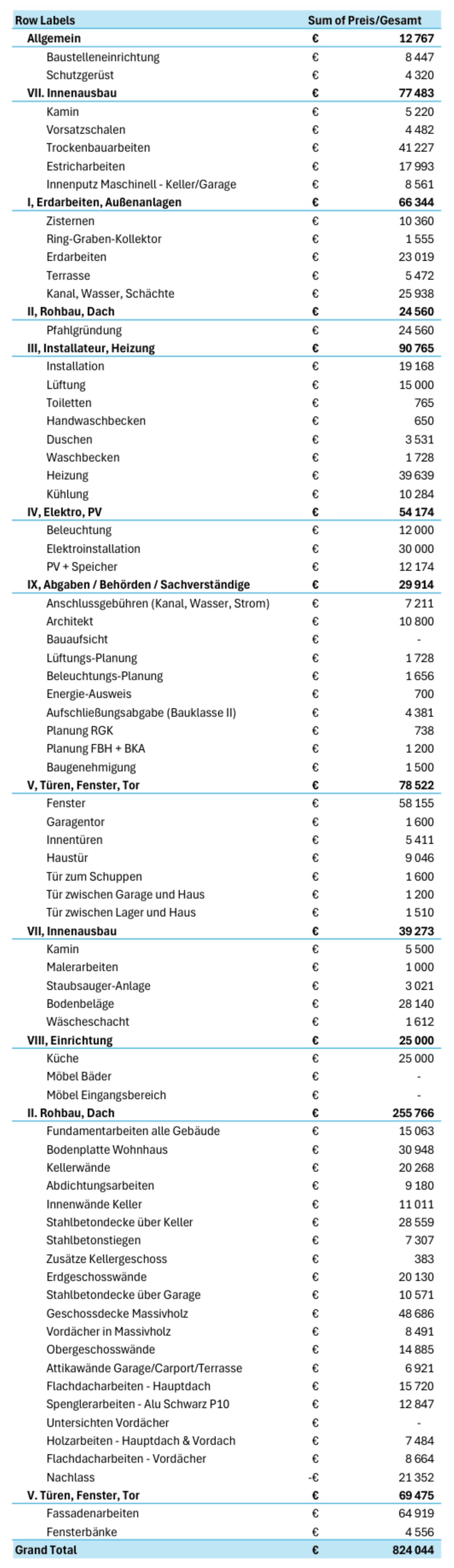 Hier mal ein Auszug aus unserer Kostenplanung (hat so an die 300 Einzelposten): Folgende Eigenleistungen sind berücksichtigt: