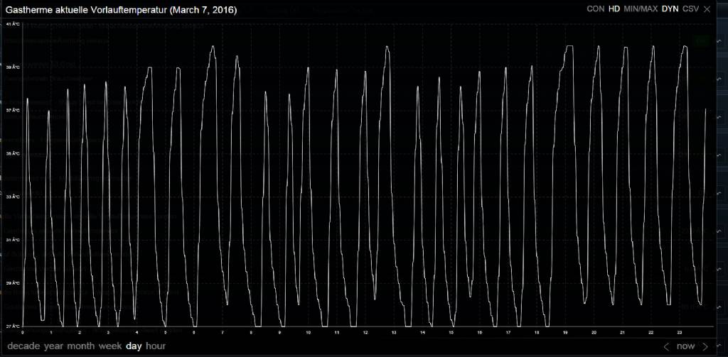 Hängt vom Thermenmodell ab. Es gibt wohl sehr viele, die wirklich mit Vollgas starten...war beim typischen Einsatzgebiet der Gasthermen (nämlich mit Radiatorenheizung) auch ned so tragisch...bei FBH FBH [Fußbodenheizung] mit niedrigen Vorlauftemperaturen könnts ein Problem werden...da gabs hier eh schon mal einen Thread drüber. Meine startet glücklicherweise "nur" mit ca. 30 % und geht dann zurück auf Minimummodulation. BTW, bei jedem Brennerstart geht mal die meiste Heizenergie direkt beim Rauchfang raus... Ich habs eh so...indirekt zumindest. Problem ist aber, dass du die Vorlauftemperatur begrenzen mußt, weil es für die FBH FBH [Fußbodenheizung] dann ned so prickelnd ist, wennst mit 50 Grad reinfährst. Im Bild sieht man recht "schön", dass sie auch mit Minimummodulation (5kw) relativ rasch zur Abschaltgrenze (ca. 40 Grad) kommt und dann per "Wiedereinschaltsperre" (in meinem Fall ca. 25 oder 26 Grad) wieder startet. Diese 26 Grad sind das äusserste Limit, Fussbodentemperatur ist natürlich entsprechend geringer. Mehr gings bei mir nicht mehr zu optimieren (5 kw Minimum, 190 m2 Wohnfläche, ca. EKZ 40, Heizlast ca. 8 kw), die Therme taktet 1-2 mal pro Stunde. Ist schon eine Riesenoptimierung...der "Heizungsbauer/Installateur" hats mit 4 mal pro Stunde übergeben... Heislplaner hat ein kleineres Haus (fast die Hälfte) mit einer größeren Therme... Glaubts mir, das ist takttechnisch unter diesen Voraussetzungen nicht in den Griff zu bekommen...ned mal mit der besten Steuerung |