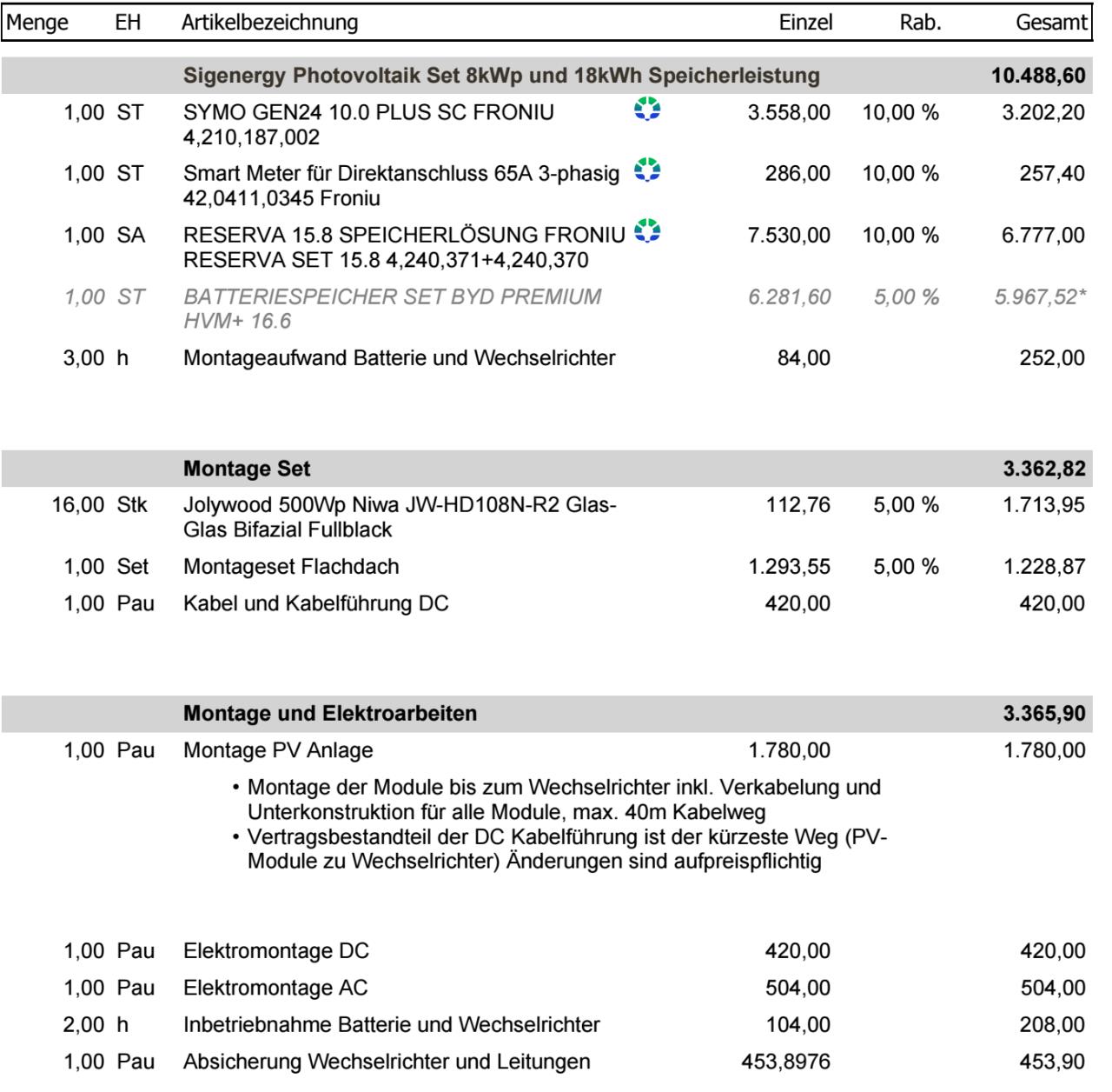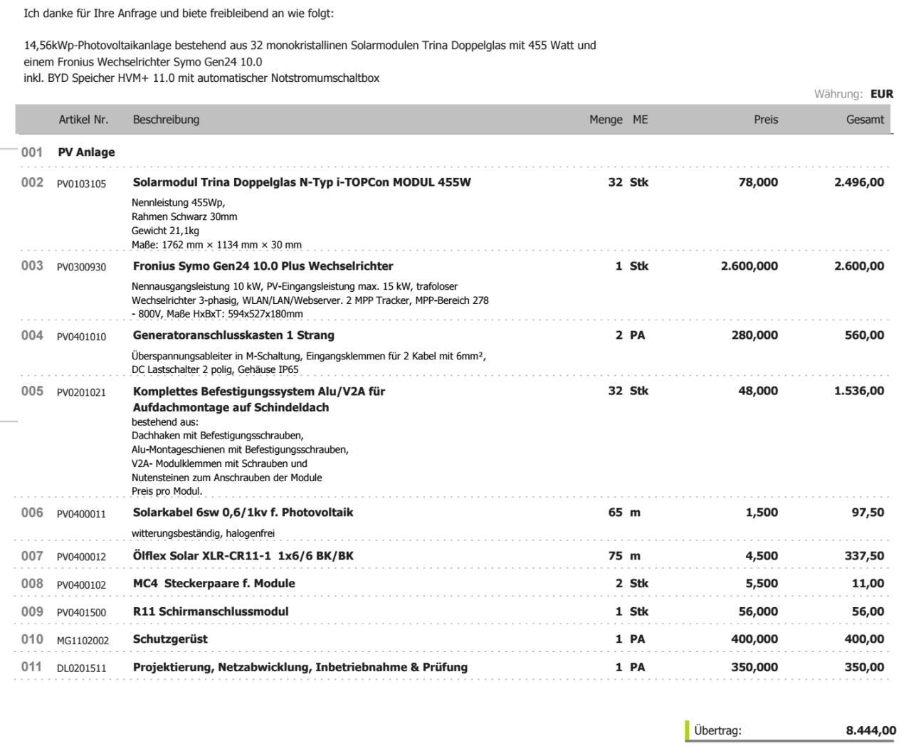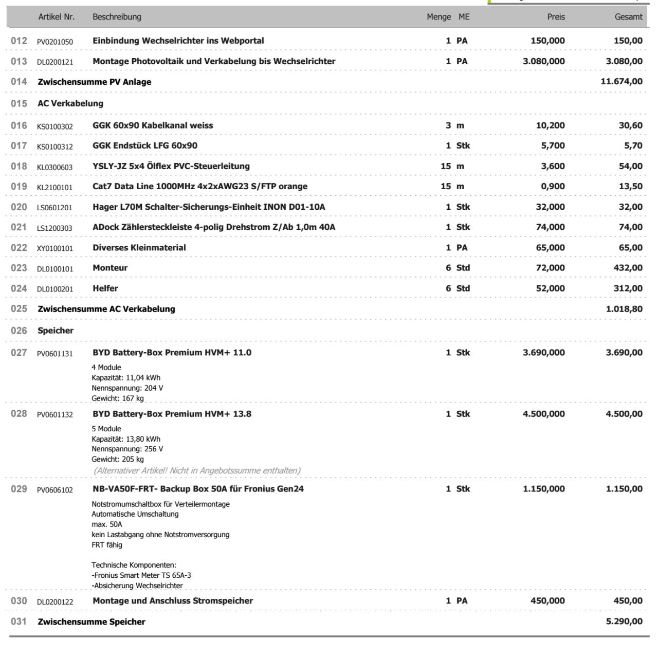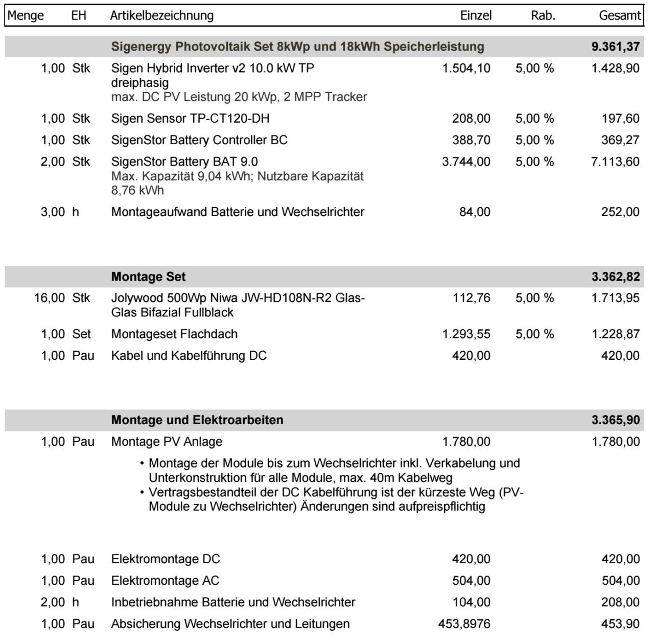 So, ich glaube ich mit den Posts beschränkt am Tag. Deshalb antworte ich allen in einem 😉 Zu Solarbuddys #15 und#22 Wow dankefür die internen Infos über Sigenergy, ich denke ich werde zu Fronius greifen, auch wenn es etwas teurer wird. derLandmann #16 In der Tat, der 2. Elektriker meinte ich kann mir alle Komponenten selbst besorgen falls ich sie günstiger bekomme, Eigenleistung ist auch willkommen. Danke für den Link, ich habe auch bereits Komponenten gesucht und bin unter anderem bei Sustainable Future Brokers fündig geworden. (Anbei ein Foto mit Preisen) ![]() Spt42 #17 Der Cloud-Zwang stört mich auch etwas und wäre alleinig kein K.o. Kriterium gewesen. Aber es gibt doch noch mehr die dazu kommen. Stefan4713 #18 Vielen Dank für die Erfahrungswerte, da kann ich mich schon gut orientieren. Eine super Tabelle zum vergleichen. Ich werde wahrscheinlich auch kleiner anfangen und dann weitersehen wie es sich entwickelt. Lu1994 #19 und Dirm #21 Ja, ich werde mich bezgl. Verteilerkasten noch mal schlau machen und das in die Kosten einkalkulieren. Ich habe jetzt 2 Angebote bekommen, die poste ich extra |