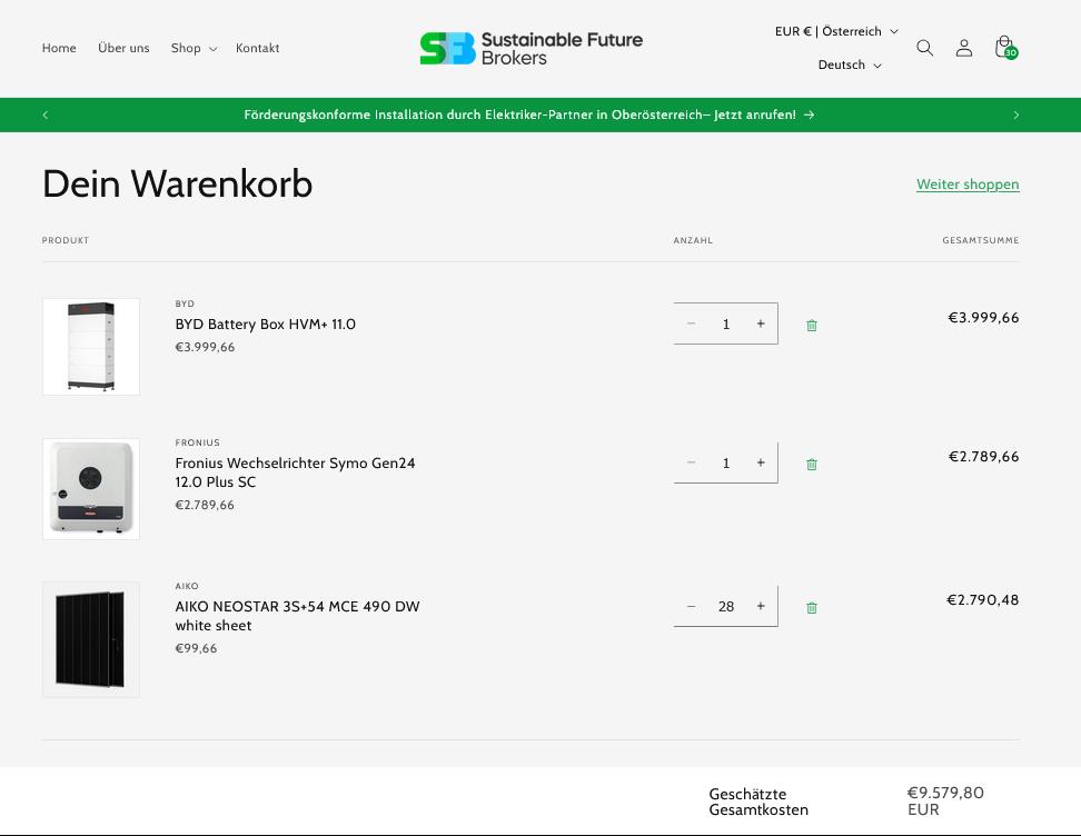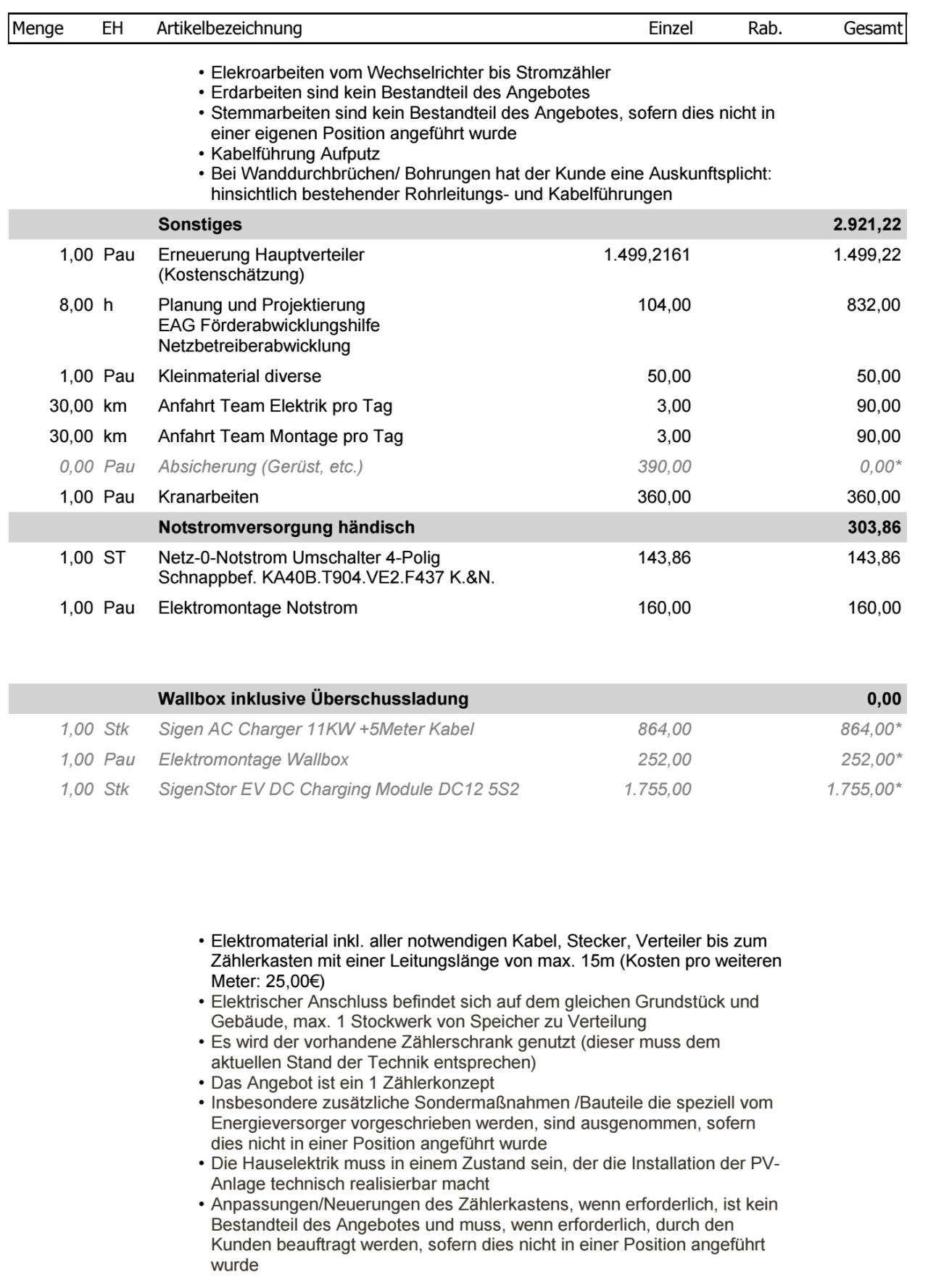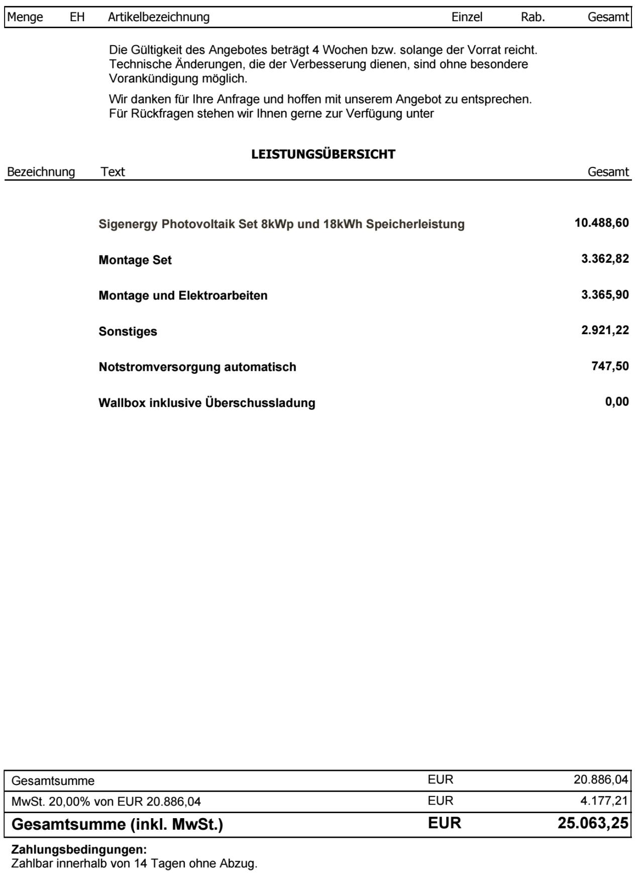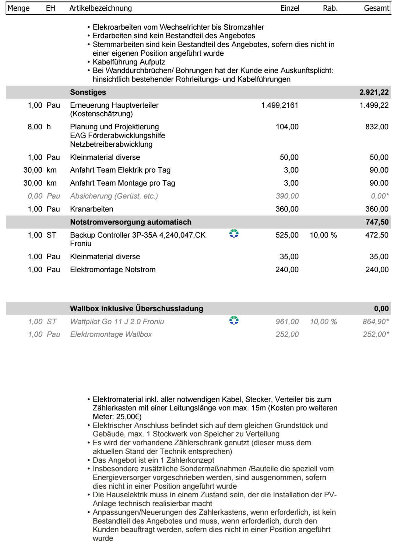 So, ich glaube ich mit den Posts beschränkt am Tag. Deshalb antworte ich allen in einem 😉 Zu Solarbuddys #15 und#22 Wow dankefür die internen Infos über Sigenergy, ich denke ich werde zu Fronius greifen, auch wenn es etwas teurer wird. derLandmann #16 In der Tat, der 2. Elektriker meinte ich kann mir alle Komponenten selbst besorgen falls ich sie günstiger bekomme, Eigenleistung ist auch willkommen. Danke für den Link, ich habe auch bereits Komponenten gesucht und bin unter anderem bei Sustainable Future Brokers fündig geworden. (Anbei ein Foto mit Preisen) ![]() Spt42 #17 Der Cloud-Zwang stört mich auch etwas und wäre alleinig kein K.o. Kriterium gewesen. Aber es gibt doch noch mehr die dazu kommen. Stefan4713 #18 Vielen Dank für die Erfahrungswerte, da kann ich mich schon gut orientieren. Eine super Tabelle zum vergleichen. Ich werde wahrscheinlich auch kleiner anfangen und dann weitersehen wie es sich entwickelt. Lu1994 #19 und Dirm #21 Ja, ich werde mich bezgl. Verteilerkasten noch mal schlau machen und das in die Kosten einkalkulieren. Ich habe jetzt 2 Angebote bekommen, die poste ich extra |