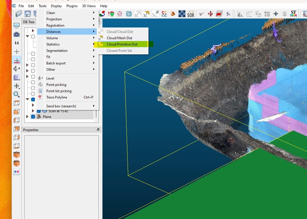 3. Schritt: Punktewolke "zerteilen" bei Ebene diesmal Punktewolke + Ebene gleichzeitg anwählen und aif Tools -> Distances -> Cloud/Primitive Dist. gehen.