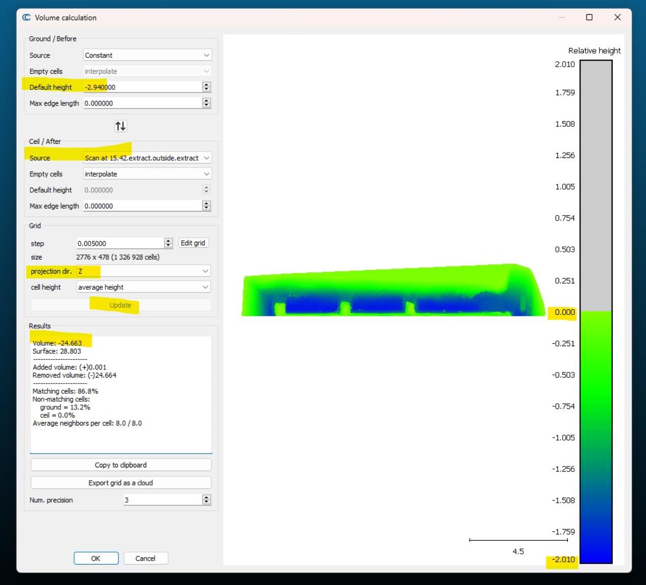 In dem Dialogfenster wird bei default height die position der Ebene eingegeben (Vorzeichen beachten!) die Source sollte bereits die zuvor ausgewählte Punktewolke stehen. Bei Projection Dir die richtige Achse auswählen (in meinem Fall Z) -> dann Update klicken. Das Raster ist in meinem Fall auf 5mm eingestellt. Je nach Dichte der Punktewolke kann hier auch gröber eingestellt werden. Bei Results steht dann das Volumen. Über die Heatmap sollte ein Sanity-Check durchgeführt werden. Die Skala sollte bei 0 beginnen.