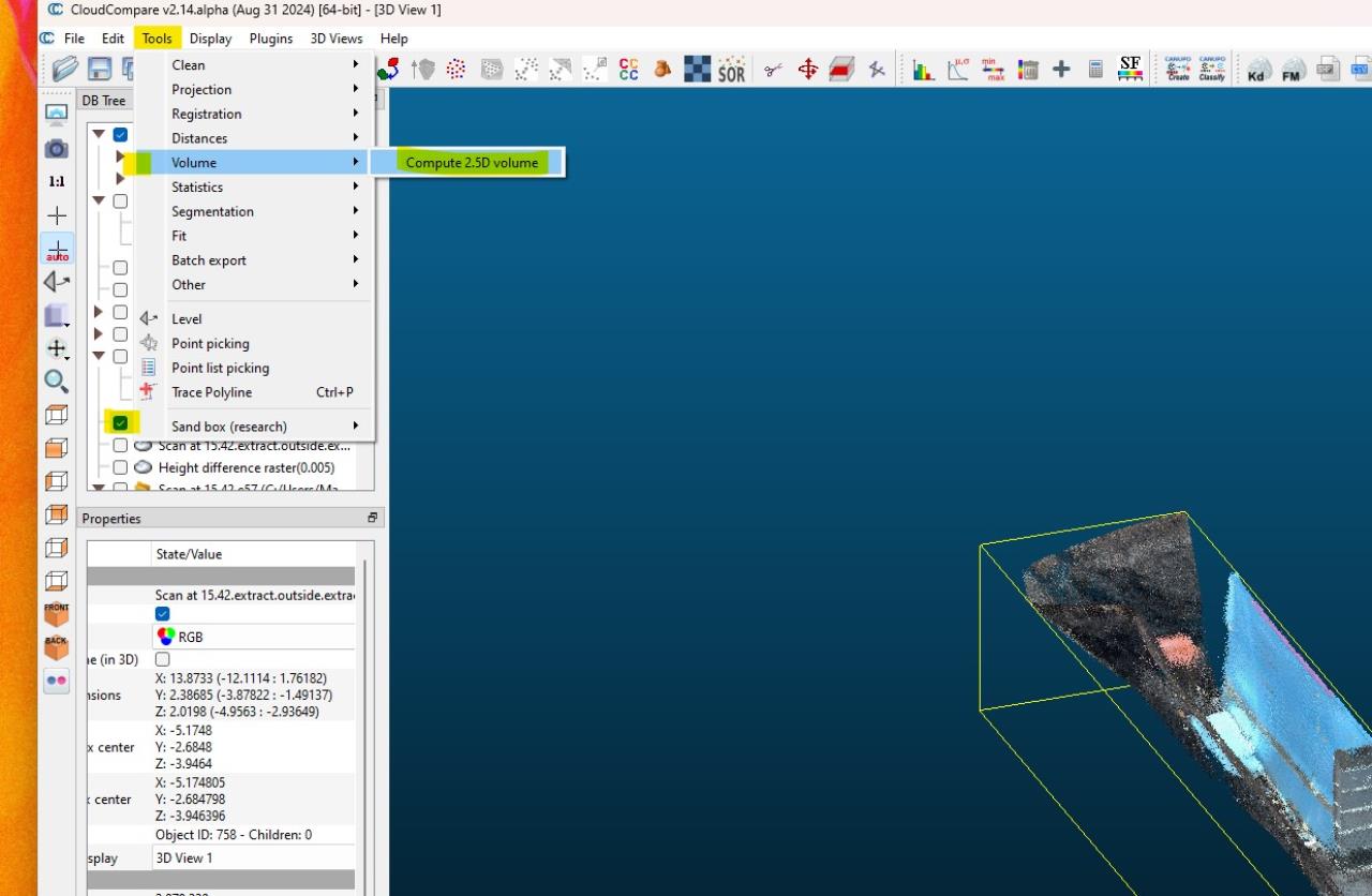 Für Schüttvolumen ist 2.5D meist ausreichend. Cloudcompare interpoliert ein Mesh zwischen den Punkten und errechnet anhand eines Rasters dann das Volumen.