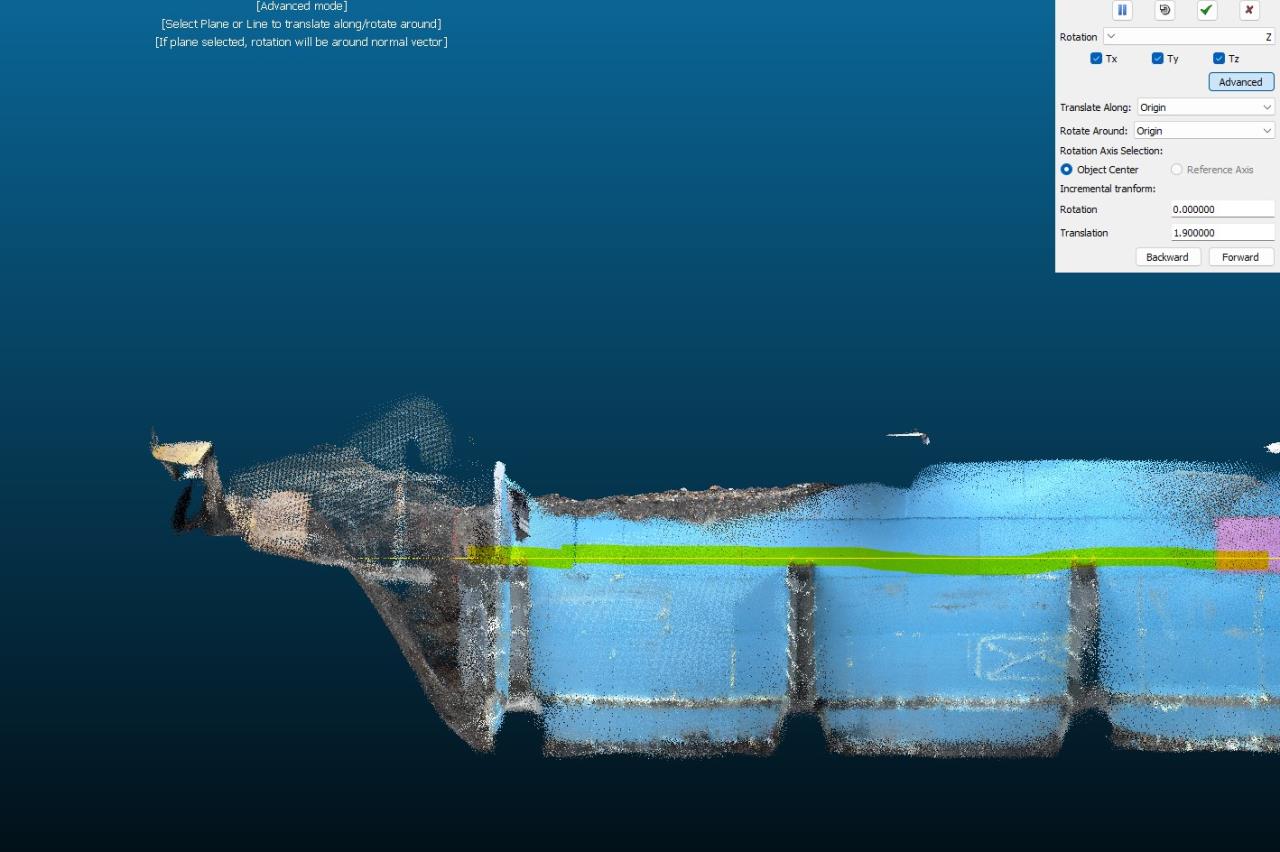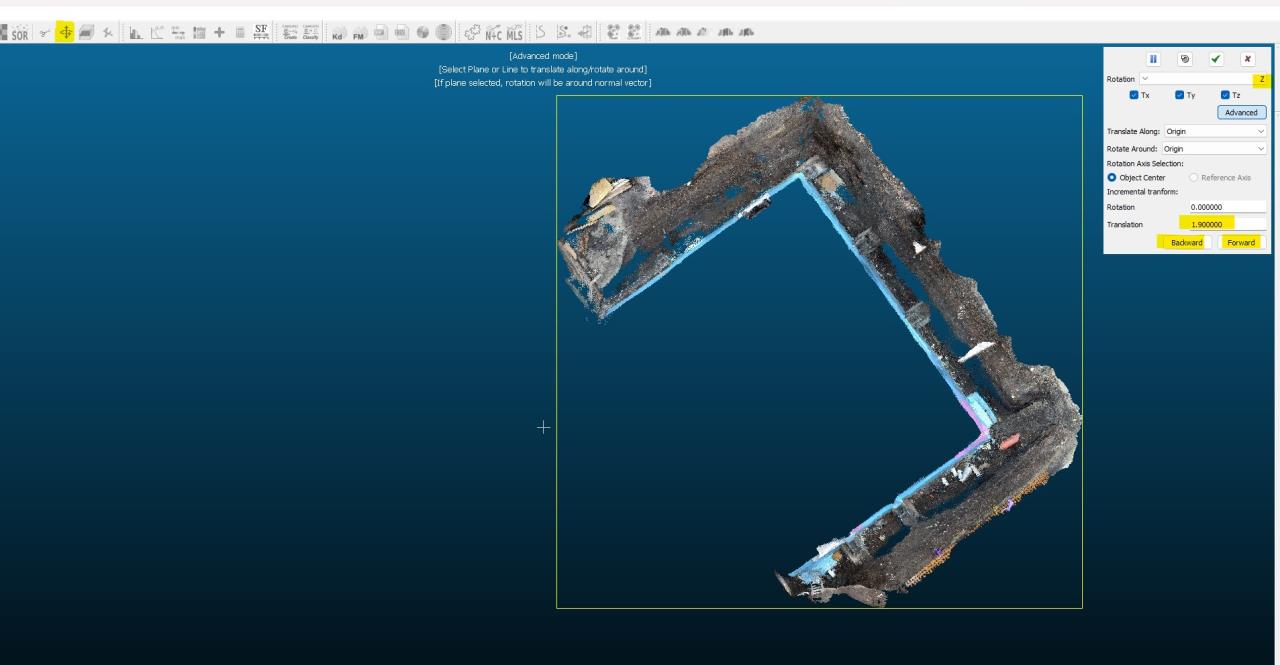 Mit dem "Translate & Rotate" Werkzeug lässt sich die Punktewolke drehen und verschieben. Für Rotation die Z-Achse auswählen.
