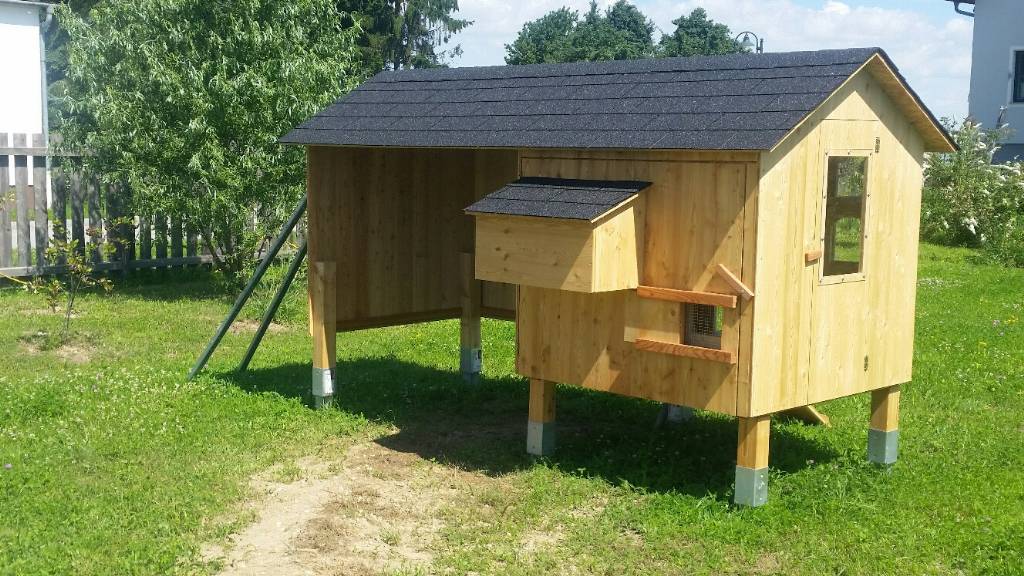Ein regensicherer Unterstell- und Futterplatz. Und ev. als erweiterbarer Stall, falls es doch noch ein paar Hühner mehr werden |