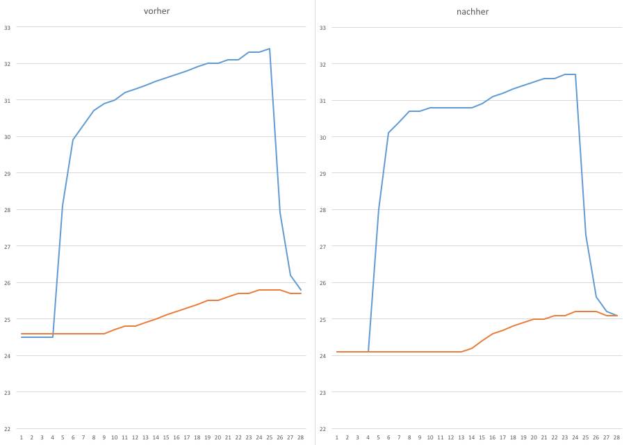 wir hatten das ein paar seiten weiter vorne an der anlage von mho perfekt zu sehen... http://www.energiesparhaus.at/forum/39756_7#323112 links schlecht abgeglichen, rechts perfekt abgeglichen die zeit bis nach taktbeginn der rl zu steigen beginnt ist dieser rl-kick. je länger sich der rausschieben läßt umso großzügiger ist das fbh-netz und umso besser der abgleich. das bedeutet daß die wärme ins gesamte haus geht und nicht vorzeitig zur wp zurück kommt... |