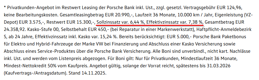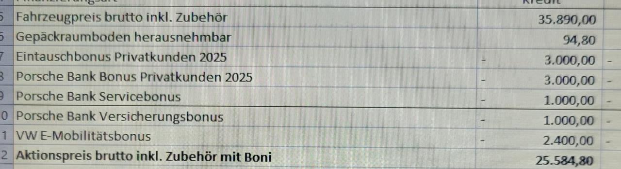 Ja, ist wirklich so. Unser ID.3 Pure Business 52kWh 125kkW mit allen Boni auf 3 Jahre EUR 25.585 statt Barkauf EUR 35.985 |
