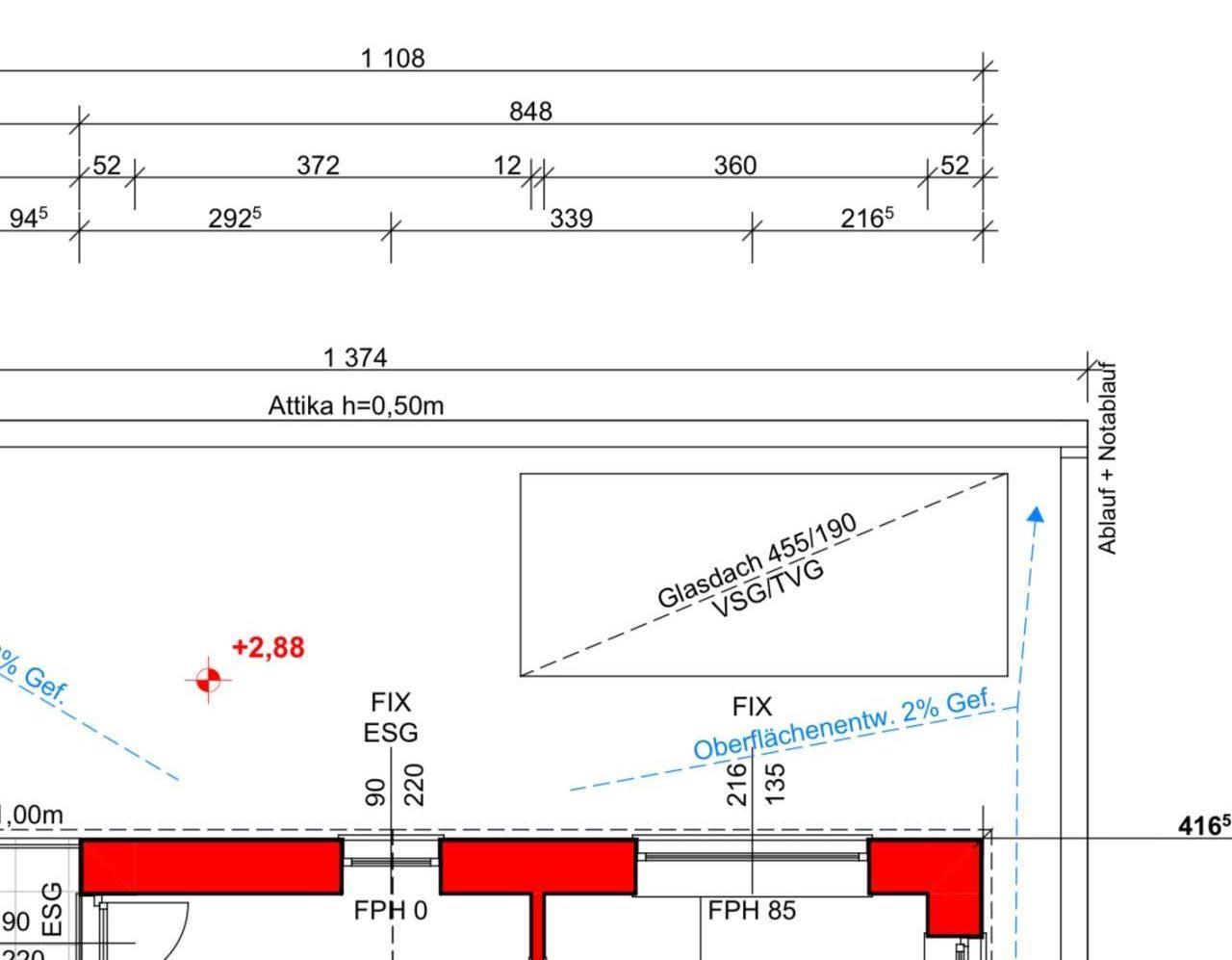 Mal ganz abstrakt betrachtet: Wenn du Tageslicht willst, muss dort entweder Glas oder Luft sein. Wenn du ein Dach willst, bleibt nur Glas. Und Glas ist halt leider teuer. Wenns billiger sein soll, könntest du stattdessen einen Pergolabausatz nehmen. Aber schaut halt auch nicht so gut aus wie am Plan. Und das Glas ist noch immer teuer. Wenns schon teuer wird, könntest du statt dem Glas durchsichtige PV-Module einbauen, dann kriegst du wenigstens noch ein bissl Strom raus. OT: Willst du den Technikraum wirklich außerhalb der thermischen Hülle haben? |