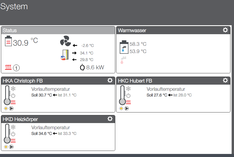 Sieht man leider öfter... Ohne Umbau (Garantie!?!) könntest du vllt nächsten Winter mal versuchen den Mischerkreis "stillzulegen". Du stellst den Mischer auf "manuell" (z.B. Einstellrad Rausziehen bei ESBE Mischern) und versuchst die HK Pumpe auf den min. Vol Strom der WP WP [Wärmepumpe] anzugleichen. Eventuell wird es dann in manchen Räumen zu kalt, die Kanibalisierung des WW WW [Warmwasser] Speichers sollte dann aber weg sein. Wenns dann zu kalt wird müsstest du halt die VL VL [Vorlauf] Ströme wieder anpassen, bzw. einen therm. Abgleich hinzubekommen... Da bin ich bei dir. Die "Experimentierkosten" (für die Umbauten) müsstest halt erstmal du tragen und das den Handwerkern auch so kommunizieren... oder selber machen (lassen). Voraussetzung ist halt, dass du keine ERR ERR [Einzelraumregelung] hast, bzw. diese deaktiviert sind. ______________________________________________________________________________________________ (das kann ich nur unterstreichen) Ich habe hier die gleiche Erfahrung gemacht... Aus Kundensicht: leider schaffen sie sich durch das Verhalten (ganz allgemein - ich habe im Prinzip ähnliche, aber auf technisch völlig anderen Grundlagen Erfahrungen damit) viel mehr Arbeit als sie eigentlich haben müssten. Konkret ging es um den Tausch eines Bauteils, welches selbst ein handwerklich geschikter Laie in max. 10 Min. bewerkstelligen könnte. Ausgetauscht wurden in dem Fall aber auch diverse Anbauteile (Gehäuseteile etc., welche noch intakt waren) aber dann dennoch wieder an die Anlage angepasst werden mussten (Dauer ca. 90 Min). Dies erhöht natürlich die Kosten für das Ersatzteil/ Einsatz erheblich (unnötige Teile) Dabei klagen die Hersteller und Heizungsbauer ständig, dass das Arbeitsvolumen zu groß und das Personal zu klein ist. Aus meiner Sicht ein hausgemachtes Problem ohne Grund. Ja, probier das mal aus... meiner Meinung nach sind diese Strategien alles andere als "intelligent". Ich verzichte mittlerweile darauf... Z.B. PV Erhöhung der VL VL [Vorlauf] Temperatur: Einstellmöglichkeit für den Benutzer: Erhöhung von 0 - 6K in 0.1K Schritten. "Intelligentes" IDM Verhalten bei einer Einstellung von z.B. 3K: Sobald auch nur ein Watt vom Dach kommt (muss noch nicht mal Überschuss = Einspeisung sein) geht VL VL [Vorlauf] Soll um diese 3K hoch und die Anlage poltert los um wieder auf VL VL [Vorlauf] Soll zu kommen. Mit Puffer und Mischer wird dabei zuerst der Puffer "geladen" und dann der Mischer langsam wieder aufgemacht. Dies geht noch in rel. annehmbarer Zeit, was aber auch der einzige Vorteil ist. Nennenswert Energie bringt man mit 1, 2 oder 3K mehr aber wohl nicht in den Puffer. Das Verhalten entspricht auch nicht direkt den hier immer propagierten Hydraulikschemata Direktkreis oder Puffer seriell im RL RL [Rücklauf]. Hat man Direktkreis oder Puffer im RL RL [Rücklauf] versucht die WP WP [Wärmepumpe] eisern die neue VL VL [Vorlauf] Soll Temp zu erreichen (mit erhöhter Leistung). Gerade in Zeiten mit schwankenden und geringem PV Überschuss führt das dann genau zum Gegenteil des eigentlich erwünschten --> Netzbezug für die Überhöhung. Intelligentes Verhalten wie ich es mir vorstellen würde: Die einzustellende VL VL [Vorlauf] Soll Temp Erhöhung sollte eine Art maximal erlaubte Erhöhung darstellen, die echte VL VL [Vorlauf] Soll Temp Erhöhung sollte sich dann grob am aktuellen Überschuss orientieren. Aber das ist wohl zu weit gedacht. Noch weniger "intelligent" ist die PV Erhöhung vom WW WW [Warmwasser] Wasser. Ist diese aktiv und das WW WW [Warmwasser] auch nur ein paar °C unter der max. eingstellten WW WW [Warmwasser] Temp. für PV Erhöhung, rumpelt die Anlage los und lädt den Speicher wieder. --> sehr kurze Takte. Z.T. generiert Händewaschen/ ein paar Teller spülen einen Takt. Sinnlos, vor allem bei wenig/ schwankenden PV Überschuss, da der WW WW [Warmwasser] Takt in jedem Fall zu Ende gefahren wird. Blöd bei wolkigem Wetter mit stark Schwankenden PV Überschuss. Uns reicht momentan einen WW WW [Warmwasser] Ladung am Tag. Diese mache ich Nachmittags, da ist meist die PV Leistung am höchsten und auch die AT AT [Außentemperatur] ist dann in der Regel am höchsten. Am nächsten Tag gilt in der Regel das selbe... Wie oben erwähnt: EER nicht vorhanden, oder deaktiviert und du hast kein Problem. Wie oben erwähnt: EER nicht vorhanden, oder deaktiviert und du hast kein Problem. Rechne dir mal aus, was du dir in der "Pfütze" an Puffer speichern kannst! Hinweis --> mit FBH FBH [Fußbodenheizung] so gut wie nix. Ohne FBH FBH [Fußbodenheizung] bringt dir das bei einer halbwegs korrekt ausgelegten modulierenden WP WP [Wärmepumpe] auch nix. Um nennenswert Energie im Speicher zu platzieren müsste die Temperatur deutlich erhöht werden. Dies führt zu Verlusten bei der WP WP [Wärmepumpe] bedingt durch die erhöhte VL VL [Vorlauf] Temperatur und ein bischen was verliert der Speicher auch noch. Den "Reglungsaufwand" kannst du durch eine lange Mittelungszeit deiner AT AT [Außentemperatur] eliminieren. Das Sytem ist so träge, das merkst du nicht. Dementsprechend hast du auch keinen erhöhten Aufwand für die Regelung - weil du es einfach nicht merkst. Eine sehr ausgefeilte Regelung würde im besten Fall zwar nicht schaden, aber vmtl. nix bringen (außer vllt. im Portemonaie vom HB) und natürlich das komplette System komplexer und unübersichtlicher machen. HÄ? Wenn ich alles in eine gemeinsame Tonne Pumpe kann ich es besser trennen als wenn ich das nicht tue? ??? Wie oben erwähnt: EER nicht vorhanden, oder deaktiviert und du hast vmtl. kein Problem. Einmal den Volumenstrom ermitteln und dann bleibt der auch gleich... oder auch konstant.