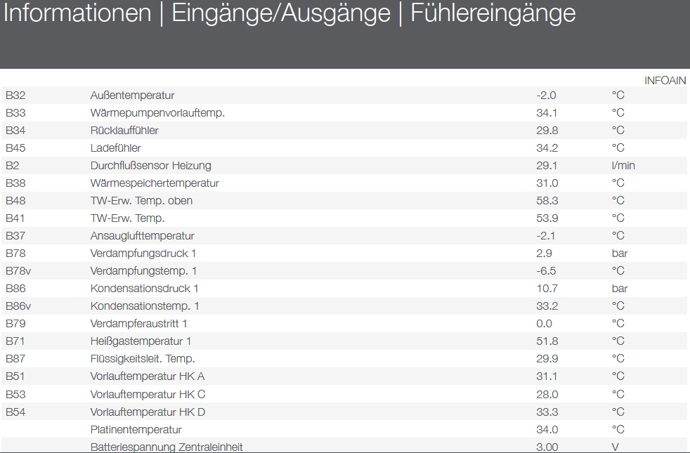 Also eher kein Schlösschen, da dürfte wie gesagt die 2-8 noch zu groß sein. Immerhin kannst du getrost in die Zukunft blicken, wenn du was neues brauchst kannst irgendwas kleines, günstiges kaufen. So eine super Effizente Anlage wie IDM oder z.B. Lambda wirds sich unterm Strich nicht rechnen. Die tausende Euros welche die Anlagen teurer sind holst du nicht mehr rein. Das war auch nicht mit Tarif gemeint, da hast du dann ja wieder keinen Einfluss. Du kannst im Menü selber manuell Sperrzeiten nach Zeitprogramm hinterlegen (Einstellungen --> Smart Grid --> Programm EVU Sperre). Dann ist die Anlage aus! Aber nicht länger als 11 oder 12 Stunden am Stück. Danach geht die auf Störung und mach nur mit dem Heizstab wieder weiter... Ja, ist anscheinend so... einfach mal ausprobieren. Schon bei 10.1°C gehts normal weiter. Passt doch! Und die vernünftigste Einstellung ohne viel Regelaufwand. Der IDM Navigator hat doch mit aktueller Software eine Auswahl für SMA. Geht es damit nicht? Eigentlich müsste der WR WR [Wechselrichter] und die IDM nur im selben Netzwerk sein... Ging bei mir mit Fenecon einwandfrei. Extra einen Elektriker hätte es dazu nicht gebraucht. Versprich dir da nicht zu viel. Bei mir würde es gehen, ich habe die "Spielereien" aber deaktiviert. Das die WP WP [Wärmepumpe] auf den Überschuss hin modulieren würde kannst du vergessen. Das ganze läuft eher sehr digital ab. Kommen ein paar Watt vom dach setzt der Regler z.B. die VL VL [Vorlauf] Temp. gemäß Überhöhung der FB hoch und die Anlage rumpelt los. Das gleiche bei der WW WW [Warmwasser] Nachladung, sobald das WW WW [Warmwasser] etwas kälter wird und PV Überschuss da ist gehts los und es wird nachgeladen. Erhöht u.U. zwar den Eigenverbrauch, generiert aber viele Takte und würde evtl. auch wieder zu Netzbezug führen, wenn kein Akku vorhanden wäre und z.B. kurz nach Start der WW WW [Warmwasser] Nachladung eine Wolke drüber zieht. Durch die höheren VL VL [Vorlauf] Temps zum "Überladen" des Puffers sinkt zudem die Effizenz noch etwas. Meiner Meinung nach kannst du darauf komplett verzichten. Dir reicht ja in der Regel eine WW WW [Warmwasser] Ladung am Tag und mit der Batterie wirst du in den helleren Monaten immer genügend Strom für die eine WW WW [Warmwasser] Ladung am frühen Nachmittag zur Verfügung haben. Kurzum: zum Puffern von PV Strom ist deine Batterie deutlich besser geeignet als der behäbige Wassertank. Ist damit der Paramter "Zuschaltzeit Heizen" gemeint? Ja, ist leider so... begleitet von der Zwangspause nach der WW WW [Warmwasser] Bereitung. Kannst ja mal den Plot der letzten Tage reinstellen... Recht viel wird aber nicht gehen, vermute ich mal. Im Schnitt hast du ja eh relativ lange Takte, dafür das die Maschine ordentlich zu groß ist. Allgemein könntest du versuchen in Form eines "Sägezahns" zu heizen, wie hier ganz unten beschrieben: https://www.energiesparhaus.at/forum-idm-ipump-a-3-11-einstellungen/84102_1#902807 Da könnte bei dir doch einiges gehen ohne Komfortverlust. |