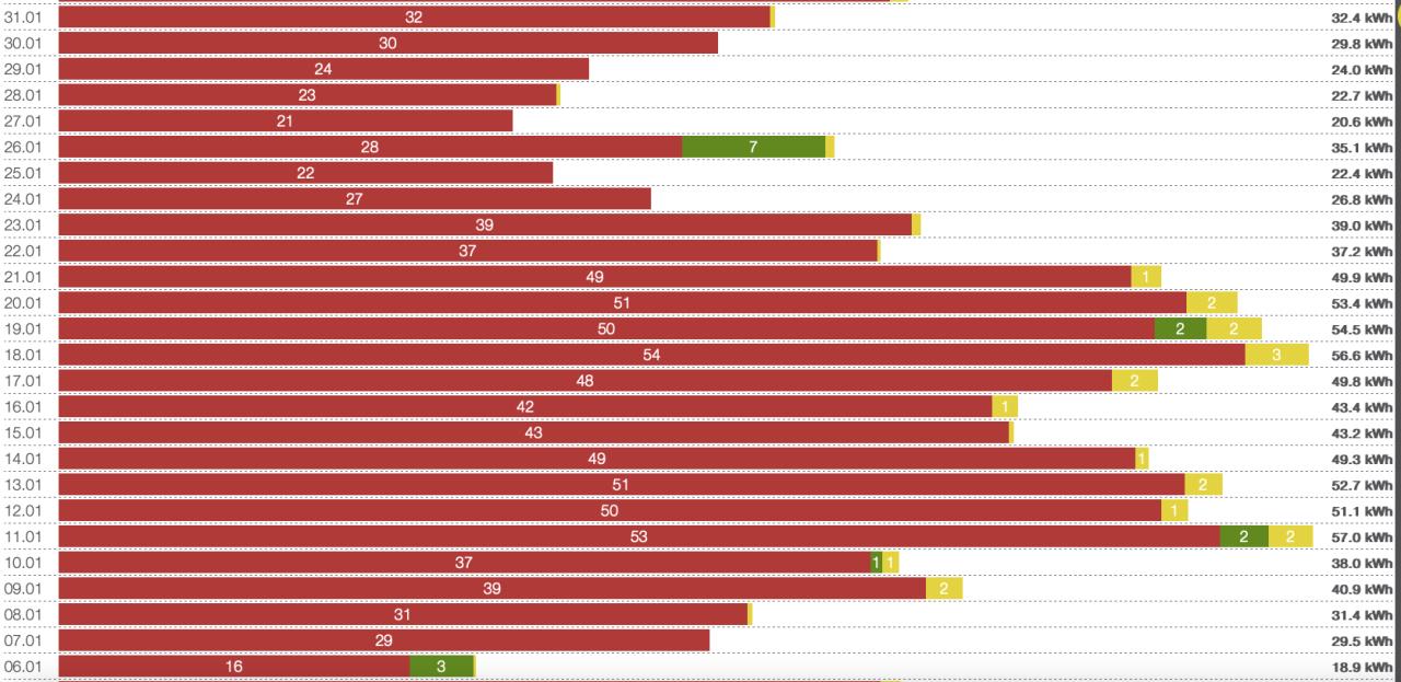 Danke schonmal für Eure Antworten. Ich fühle mich schon besser :) Wir haben einen 825l Wärmespeicher. Die neuen Heizkörper sind auf die Raumheizlast ausgelegt, aber noch nicht eingestellt. Ich habe hier eine Auflistung bekommen mit einer Berechnung auf 50°C Vorlauftemperatur und den Einstellungen für die Stellung der Ventile für den Durchlauf. Ich muss diese noch einstellen, bin aber nicht sicher ob das Sinn macht, wenn die erwähnten vier alten Heizkörper gar nicht erfasst sind. Den WP WP [Wärmepumpe] Installateur kann ich erst kommende Woche wieder erreichen (Urlaub). Im Erdgeschoss hatten war die Tür zum Treppenhaus, sowie die anderen drei Türen zum Bad, Küche und Wohnzimmer noch nicht da. Das ist jetzt anders. Das Wetter war durchwachsen. Ein paar kältere Tage, aber nicht dramatisch. Der Verbrauch (Leistungsaufnahme) war dann dementsprechend hoch. Anbei das Bild. Es fühlt sich einfach viel an. Ich kann es nicht einschätzen, aber nach dem was Ihr bisher geschrieben habt, ist es im Rahmen. Ich tue mich schwer damit zu verstehen, wie eine so geringe Heizlast, soviel Energie verbrauchen kann. Eventuell ist es auch zu früh jetzt schon zuviel rumzuspielen, da wir erst 7 Wochen hier drin wohnen. |