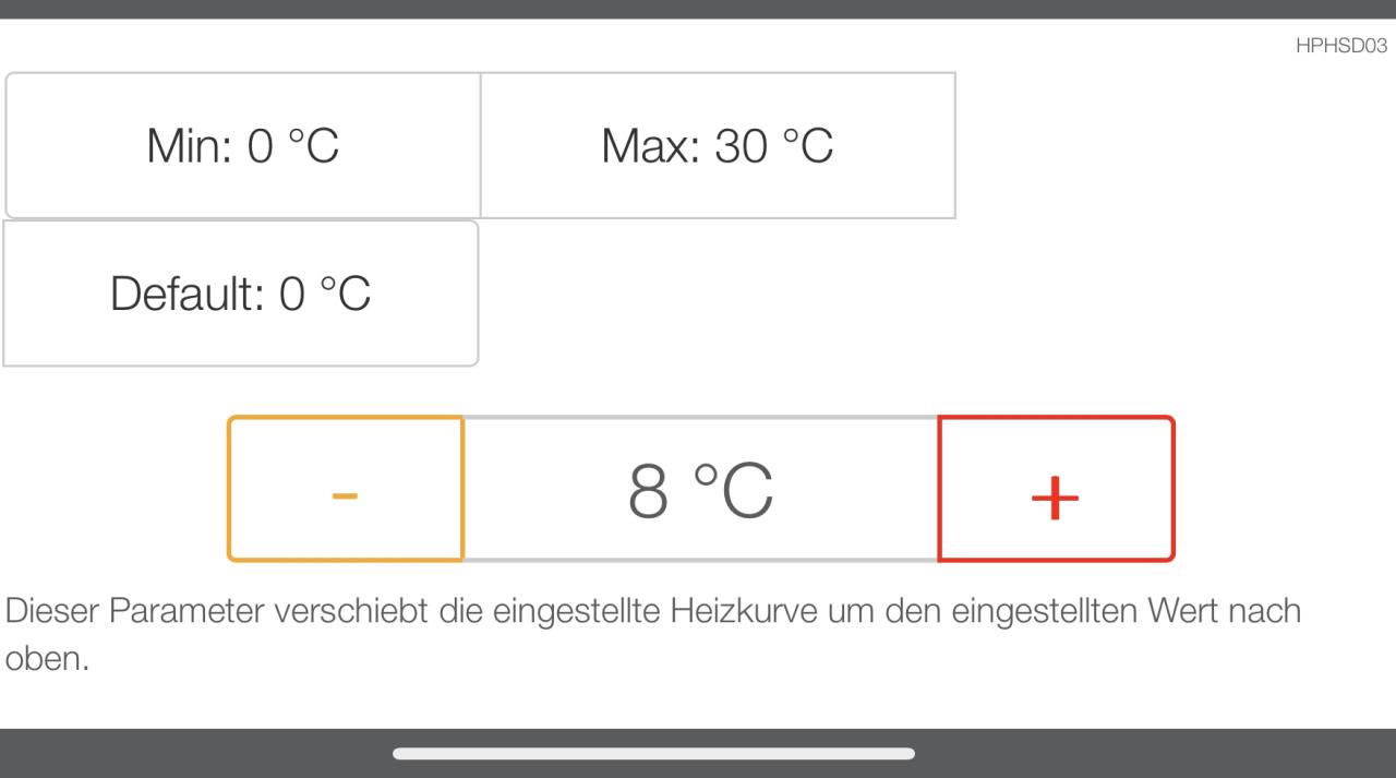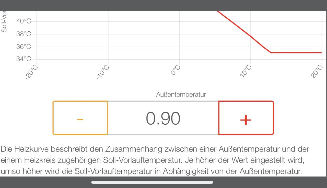 Ich habe leider keinen Bauplan der Anlage, weiss aber das noch eine Pumpe (Mischer) dazwischen sitzt. Ein Bild kann ich nachliefern. Die Steuerung übernimmt die WP WP [Wärmepumpe] selbst, meine ich. Der Speicher ist Kombi, jepp. Der Heizstab hat noch nicht geholfen. Gestern habe ich die Heizkörper eingestellt, so wie es der WP WP [Wärmepumpe] Installateur vorgegeben hat (50°C VL VL [Vorlauf]) und alle voll geöffnet, so dass die WP WP [Wärmepumpe] selbst die Reglung übernimmt. Infolgedessen ist es zunehmend wärmer geworden. Besonders in den Zimmern im OG (Schlafbereich und Bad) ist es 22° warm. So warm ist es dort noch nie gewesen. Wir wollen im Prinzip 20°C tagsüber und nachts kann es ruhig kühler werden. Paradox ist, dass es wärmer geworden ist, auch nachts, obwohl nach 21Uhr lt. des Zeitprogrammes von 20°C auf 18,5°C ECO von der WP WP [Wärmepumpe] abgesenkt werden sollte. Ich würde das jetzt beobachten, da es die kommenden Tage nachts wieder kühler wird. Anbei habe ich Screenshots der Heizkurve und der Parallelverschiebung angefügt. Wenn es so warm bleibt, welche Parameter verändere ich dann und in welchem Maß? Heizkurve1 Heizkurve 2 Parallelverschiebung FamPiez |