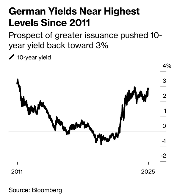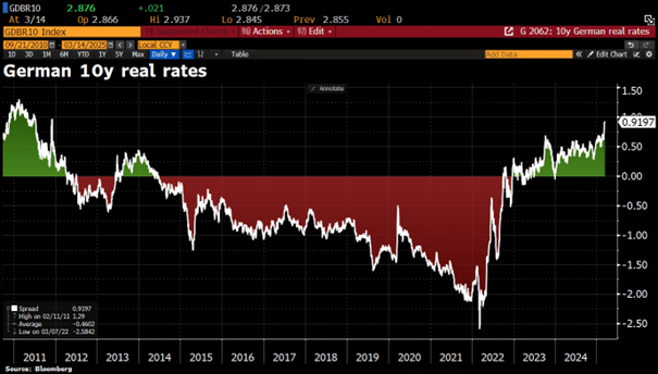 LiConsult schrieb: Eine politische Einigung zur Aufnahme eines 1.000 Mrd. EUR Schuldenplans dürfte real werden. 10Y-Staatsanleihenrenditen in Deutschland steigen auf 2,93% und haben sich somit in 2-Wochenfrist um 0,5% verteuert.