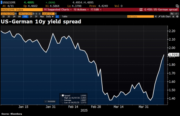 Interessant in diesen Tagen auch der Renditeunterschied zwischen den Staatsanleihen aus den USA und Deutschland (hier anhand der 10Y - Rendite). Alleine diese Woche weitete sich der "Spread" (also der Unterschied) und somit auch die Risikoprämie um 0,50% auf 1,92% aus.