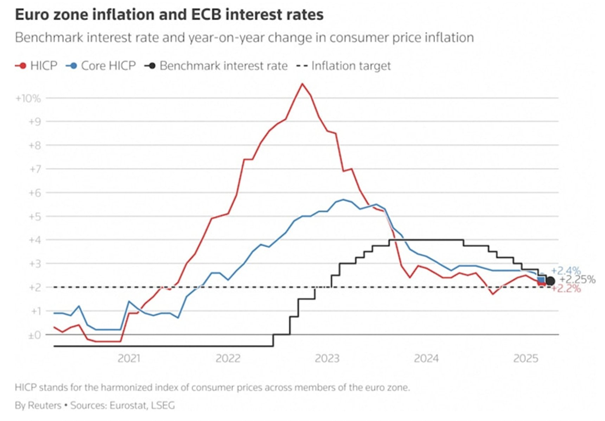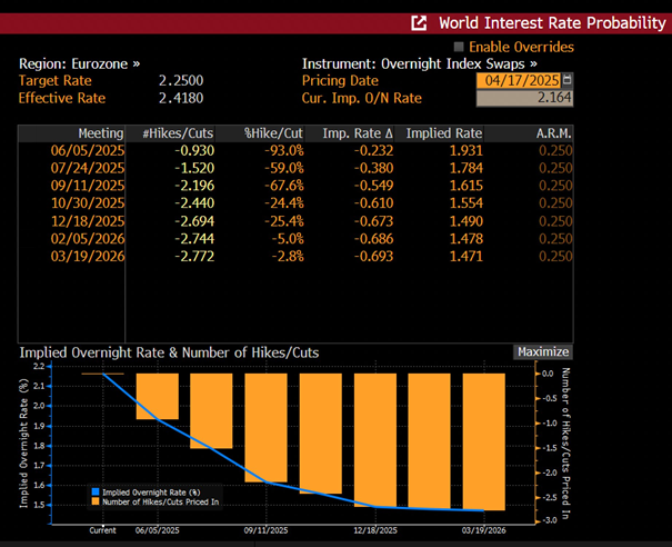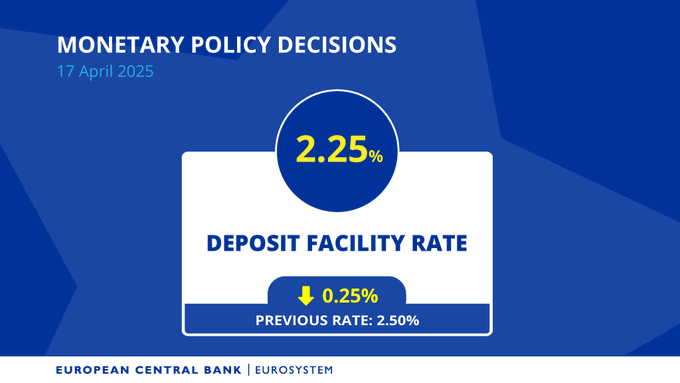 erwartungsgemäß reduziert die EZB bei der heutigen Sitzung den Einlagensatz um 0,25% auf 2,25%. Gleichlautend wird der Hauptrefinanzierungssatz (= Leitzinssatz) um 0,25% auf 2,40% reduziert und der Spitzenrefinanzierungssatz auf 2,65% gesenkt. https://www.ecb.europa.eu/press/pr/date/2025/html/ecb.mp250417~42727d0735.en.html |