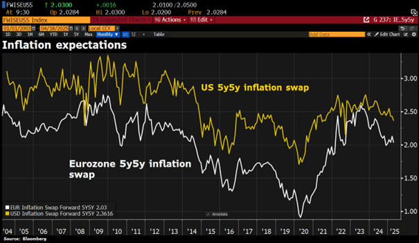 Neben der Erwartung betreffend die zeitnahe Inflationsentwicklung, wird am Markt (mittels SWAP) auch die künftige Inflationserwartung gepreist. Ein bekannter Indikator ist die sogenannte 5Y5Y-Inflationserwartung - somit die Erwartung über die künftige Inflation in 5 Jahren für die dann nächsten 5 Jahre. Auch diese sinkt derzeit und weist für den US-Raum 2,36% und für den EUR-Raum 2,03% (und somit eine Punktlandung für das EZB Ziel) aus. |