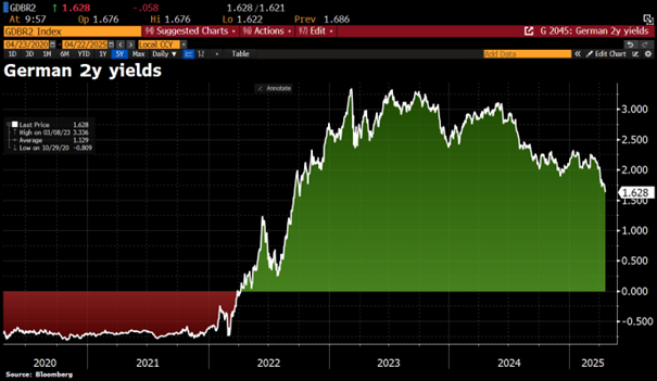 Stimmt - der plötzliche Schwenk Richtung Zölle und auch die jüngsten Aussagen zur Untergrabung der geoldpolitischen Autorität des FED haben dazu geführt, dass Kapital aus den US-Staatsanleihen (die nun deutlich höhere Renditen aufweisen) u.a. in Deutsche Staatsanleihen geflossen sind und daher auch die daraus abgeleiteten EUR-SWAPs nun deutlich tiefer notieren als noch vor einem Monat. Einige Banken haben ja darauf schon reagiert und ihre Fixzinssätze "nach unten" angepasst. btw: noch stärker reagiert der Geldmarkt, der infolge der Erwartungshaltung einer durch den sinkenden Dollar auch fallenden Inflationserwartung eine weitere Senkung des Leitzinssatzes berücksichtigt. Der 3M EURIBOR notiert heute 5(!) BP tiefer als Freitag. |