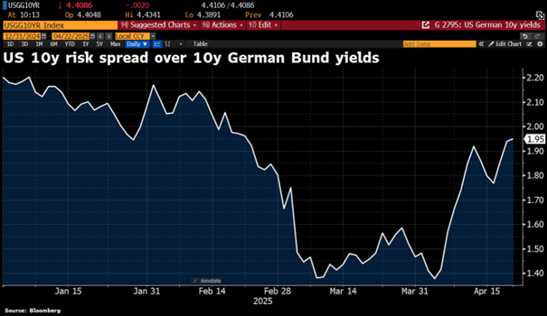In Erwartung einer nächsten Senkung bei der kommenden EZB-Sitzung am 05.06. sinken die Renditen kurzer Laufzeiten. Die als gewöhnlich verlässlicher Indikator geltende 2Y Deutsche Bundesanleihenrendite sinkt auf den tiefsten Stand seit 2022 ... ... während die Ausweitung der Risikoprämien zwischen den 10Y US-Treasuries und den 10Y Deutsche Bundesanleihen weiter voranschreitet. Deutschland wird von den Märkten als (wieder) neuer safe haven betrachtet. |