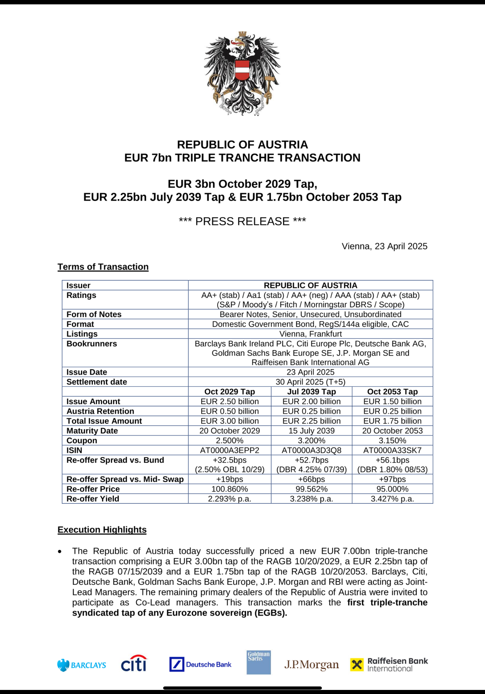 Um einen Eindruck über die aktuell starke Nachfrage im sicheren Anleihensegment (und damit sinkenden Renditen bei Staatsanleiherenditen und den daran angeschlossenen SWAPs) zu gewinnen: Die Republik Österreich hat die Gunst der Stunde genutzt und gestern drei bestehende Staatsanleihen (mit den Laufzeiten 2029, 2039 und 2053 - jeweils mit einem Renditeaufschlag von 32 bzw. 36 bzw. 52 BP gegenüber Deutschen Bundesanleihen) im Volumen von gesamt 7 Mrd. aufgestockt. Erstaunlich dabei: die Nachfrage war mit 63 Mrd. um ein Vielfaches überzeichnet und stellte damit das zweitgrößte Orderbuch in der Geschichte der Republik dar. |