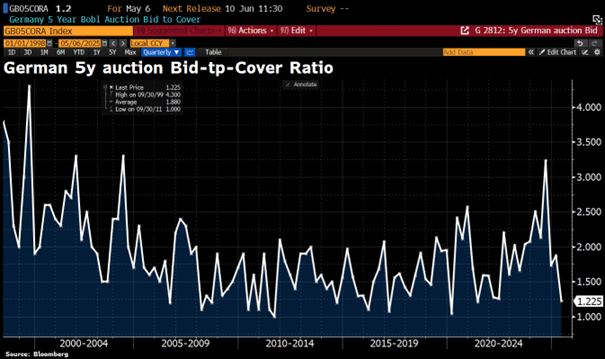 ein ganz anderes Bild von der heutigen Auktion für Deutsche 5Y Bundesanleihen: Einem Angebot von 4,5 Mrd. gingen Gebote von lediglich 4,264 Mrd. ein. Verkauft wurde am Ende ein Volumen von 3,48 Mrd.. Das Verhältnis von Geboten zu verkaufter Menge ("bid to cover ratio") in diesem Laufzeitensegment befindet sich nun auf dem niedrigsten Stand seit 2021. |