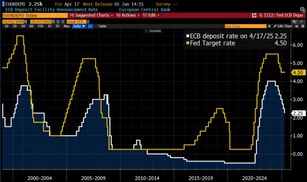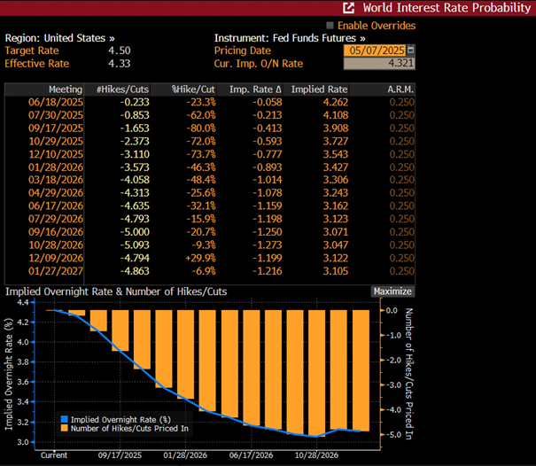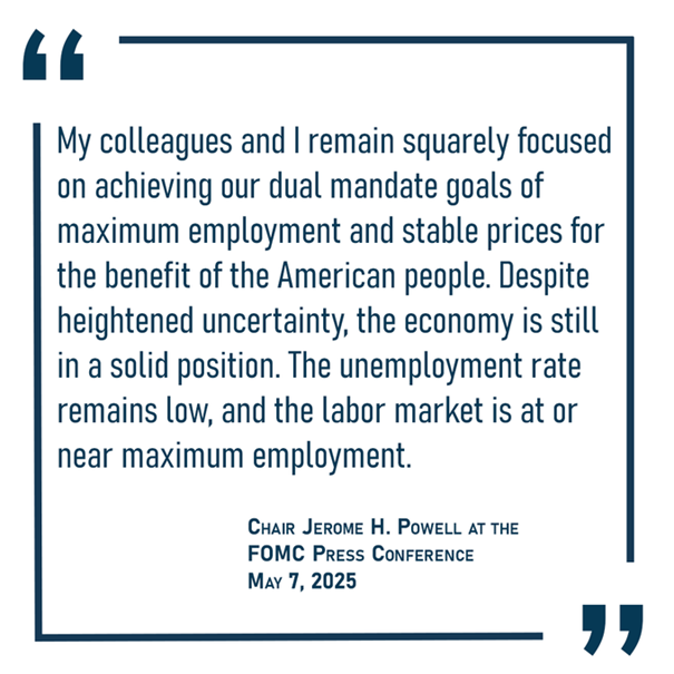 unveränderte FED-Target Rate nach der heutigen US-Notenbanksitzung trotz wachsender Unsicherheit. Forward Guidance bleibt ebenfalls unverändert. Gemäß Kommuniqué hält das FED eine höhere Arbeitslosenquote oder auch höhere Preissteigerungsraten für ähnlich wahrscheinlich. Eine Senkung bei der nächsten Sitzung (18.06.) sehe ich persönlich auch noch nicht. Die 5Y5Y-Inflationserwartung zwischen US- und EUR-Raum läuft trotz beiderseits sinkender Tendenz dennoch auseinander (und befindet sich im EUR-Raum weiterhin über der anvisierten 2% Marke). Die Markterwartung (via FED Funds Futures) sieht in den USA bis zum Jänner 2027 nur Senkungen um gesamthaft etwas mehr als 1% und die nächste Senkung bei der Sitzung am 30.07.. bezeichnend auch die Powell-Aussagen: "I don´t think we know" und "Don't think we need to be in a hurry to adjust rates." ergänzend: |