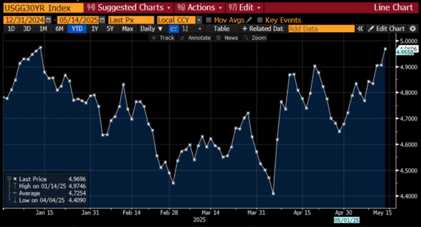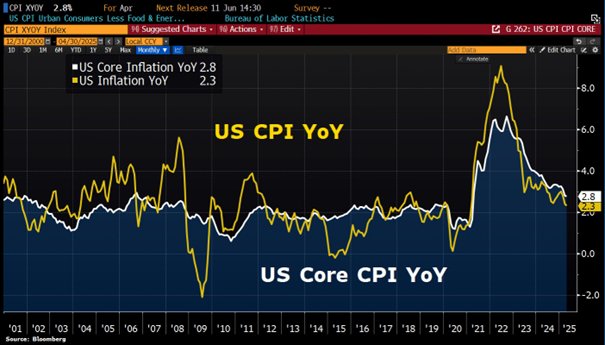 eigentlich ermutigende Inflationsdaten aus den USA - Headline-Inflation im April mit 2,3% (März 2,4%) auf dem niedrigsten Stand seit Februar 2021 und unterhalb der Konsenserwartung 2,4%. Kerninflation bei den erwarteten 2,8% ... ... jedoch: 10Y Staatsanleiherenditen wieder über 4,5% und damit auf jenem Niveau, wo Trump seine Zollpolitik teilrevidieren musste ... 30Y-Treasuries mit knapp 5% auf höchstem Stand heuer |