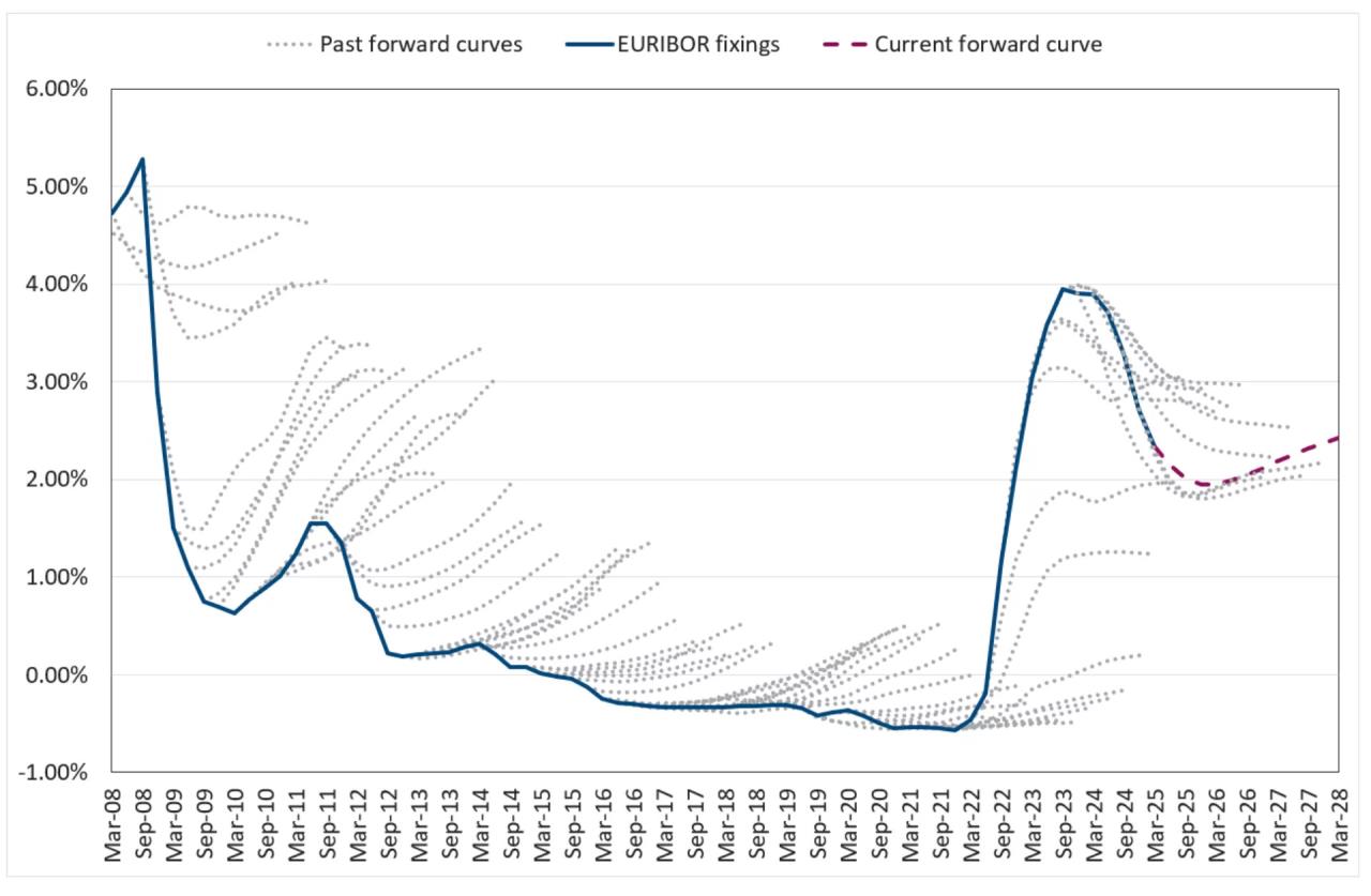 Die Grafik veranschaulicht gut was von Zinssatz-Prognosen zu halten ist... Quelle: https://www.chathamfinancial.com/insights/hairy-charts-accuracy-sofr-sonia-euribor-historical-libor-forward-curves