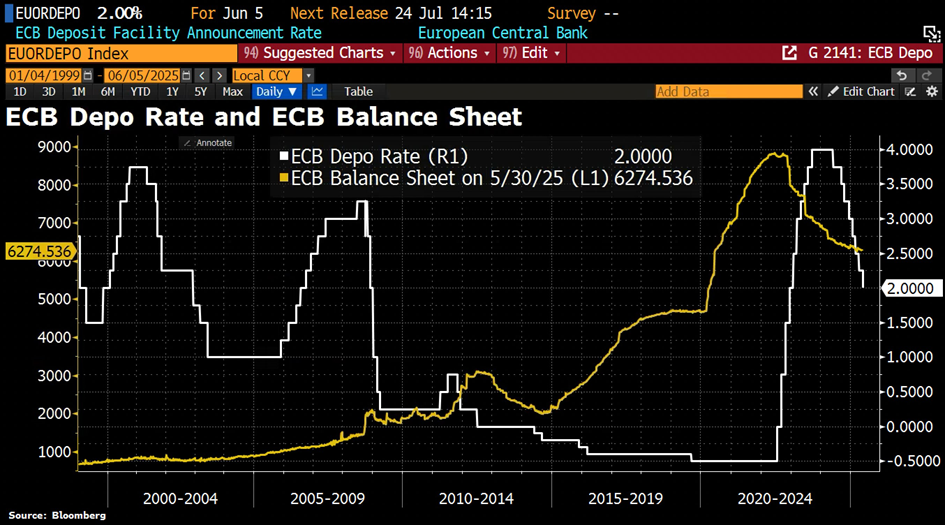 ... und so senkt die EZB per heute zum achten Mal innerhalb eines Jahres den Einlagenzins (Deposit Rate) auf 2% (Leitzinssatz 2,15%) und macht einmal mehr deutlich, dass sie sich weiter auf keinen bestimmten Kurs festlegen wird. bzw. fällt der Einlagenzins erstmals seit 2023 unter die aktuelle Deutsche Konsumentenpreisinflation btw: es gab im EZB-Rat eine Gegenstimme guess who Ein paar Lagarde-Aussagen aus der PK: - SURVEY DATA POINT TO WEAKER NEAR-TERM PROSPECTS - WAGE TRACKER POINTS TO FURTHER EASING IN 2025 - RISKS TO GROWTH TILTED TO DOWNSIDE - INFLATION OUTLOOK MORE UNCERTAIN THAN USUAL - ECB GETTING TO END OF CYCLE WITH TODAY'S RATE CUT aktueller Ausblick der EZB zum Wirtschaftswachstum innerhalb der EUR-Zone: aktueller Ausblick der EZB zur Inflation innerhalb der EUR-Zone: |