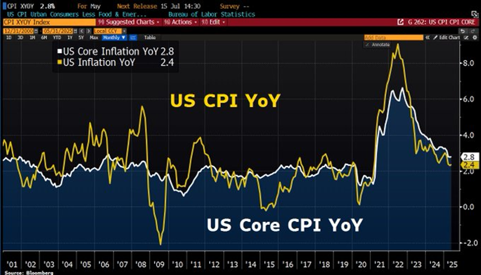 aktuelle Polymarket-Umfrage: Die Mai-Konsumentenpreisinflationsdaten (beide Werte weiterhin über dem 2%-FED-Ziel, nämlich Kernrate 2,8% versus 2,9% erwartet bzw. Gesamtinflation 2,4% wie erwartet) aus den USA dürften durch die Zölle noch nicht wirklich beeinflusst worden sein. |